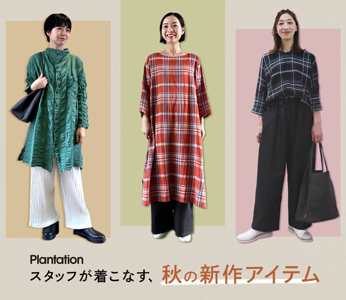 2023/08/25 | Plantation, FEATURES Plantationスタッフが着こなす、秋の新作アイテム 少しずつ気分が秋に傾きはじめるこの頃。Plantationには、今すぐ着られて長 … 2023/08/18 | Plantation, 予約会 Plantation 11月発売アイテム先行予約会 先行予約商品をご注文いただいたお客様にはポイント10倍プレゼント! 2023/08/10 | Plantation, FEATURES Plantation チェックが秋をつれてくる チェックが秋をつれてくる。 コットン100%のふんわりとしたガーゼ素材で今すぐ着 … 2023/08/02 | Plantation, FEATURES Plantationのある暮らし vol.01 モデル・染織作家として活躍中の千晶さんとご主人の龍一さんとの日常をスナップしました。
