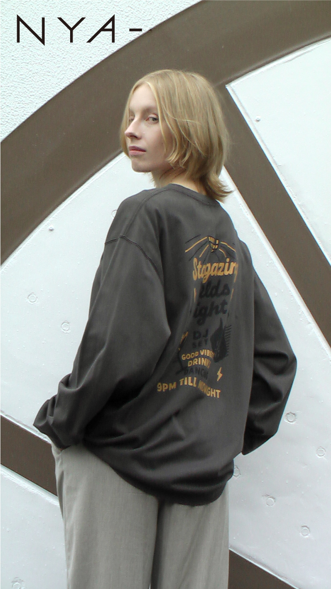 1月のテーマは「CLUB」。クラブイベントのフライヤーをイメージしたグラフィックを背中にプリントしたロングスリーブTシャツや、刺繍で表現されたほろ酔いのNYA-のTシャツなどユニークなアイテムが揃います。