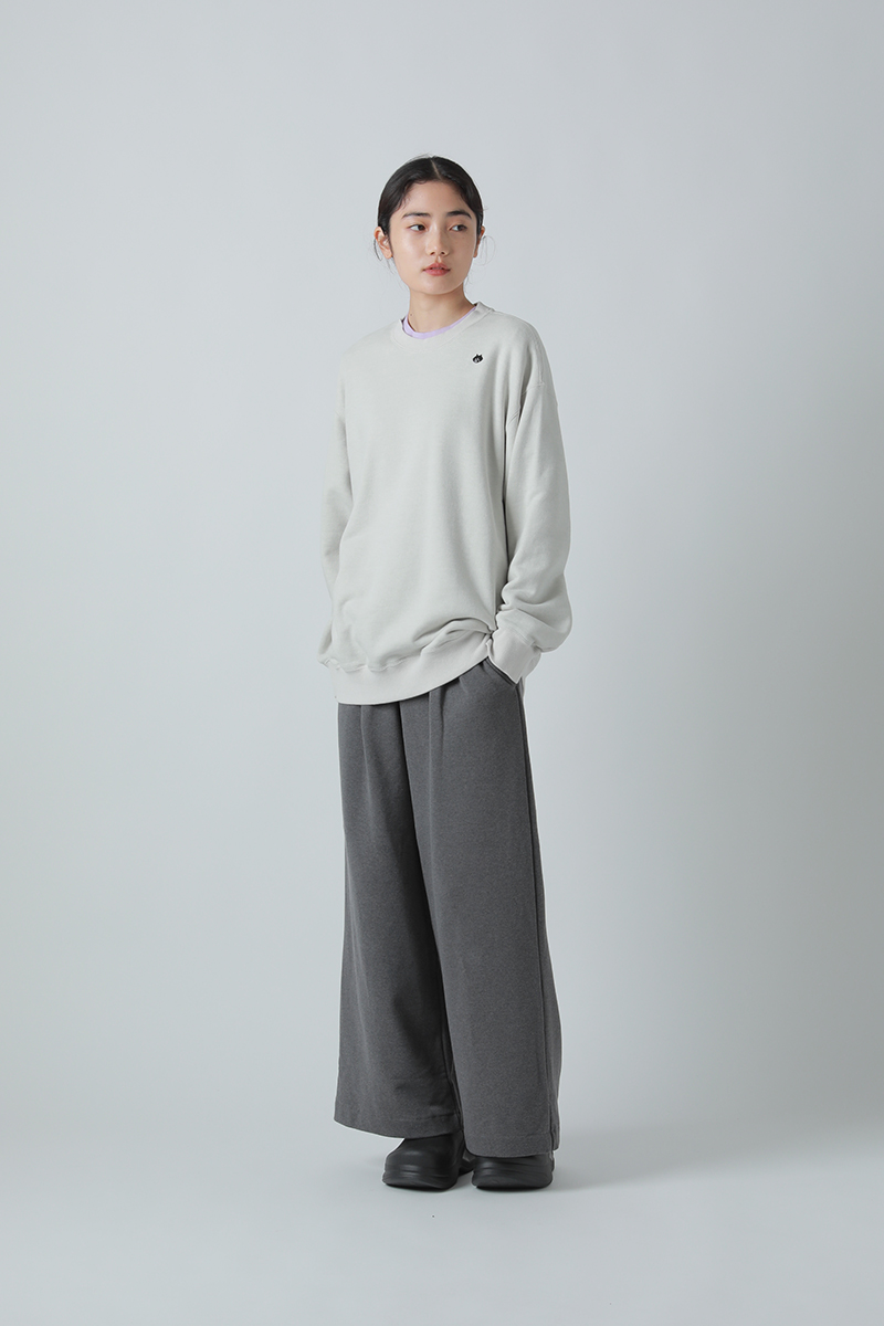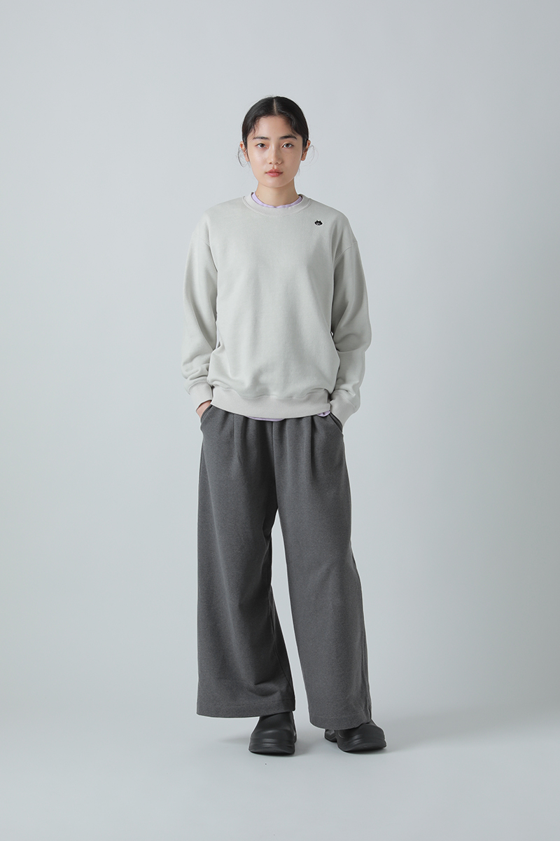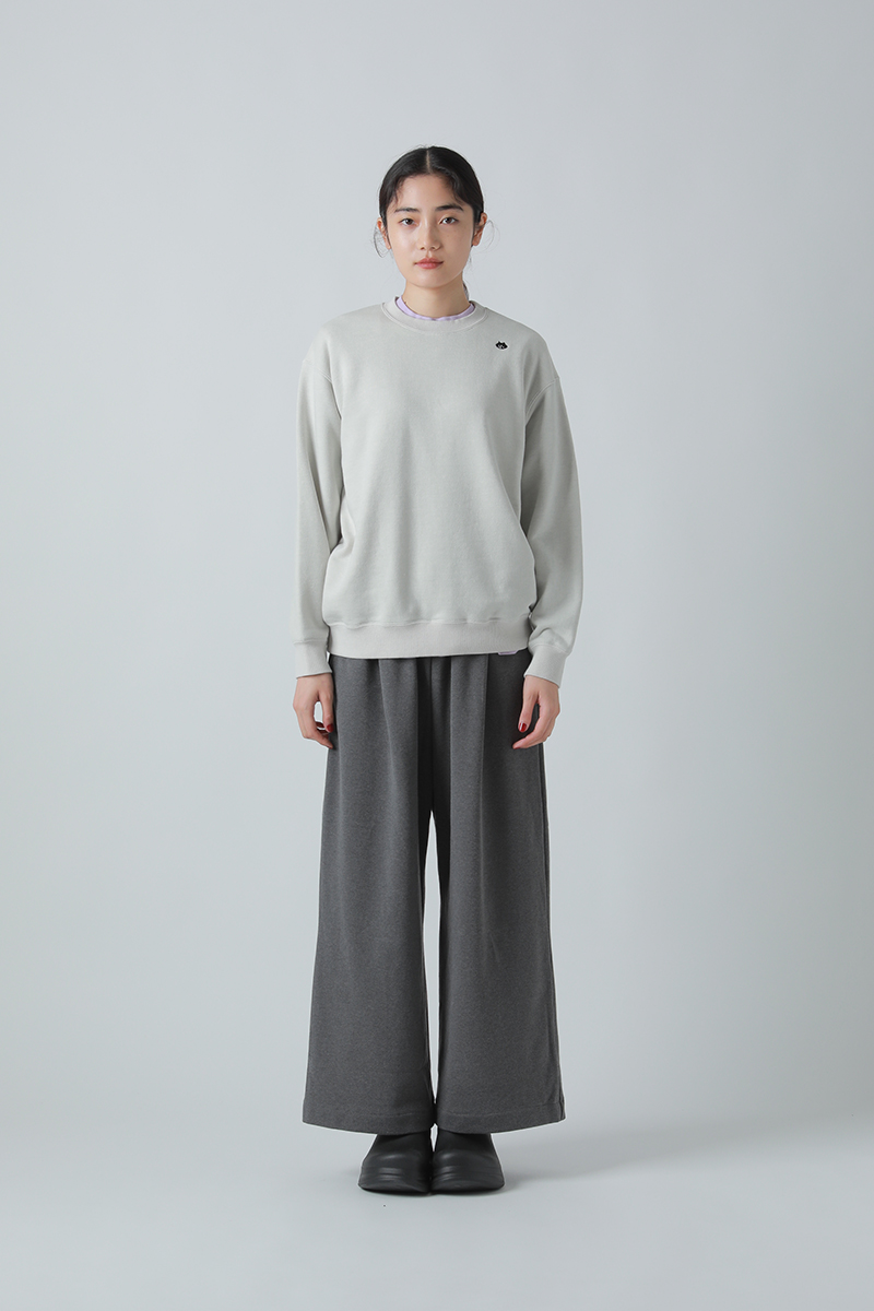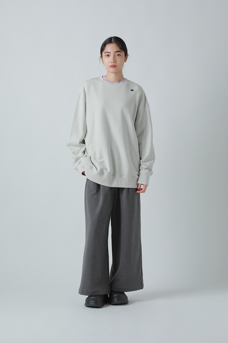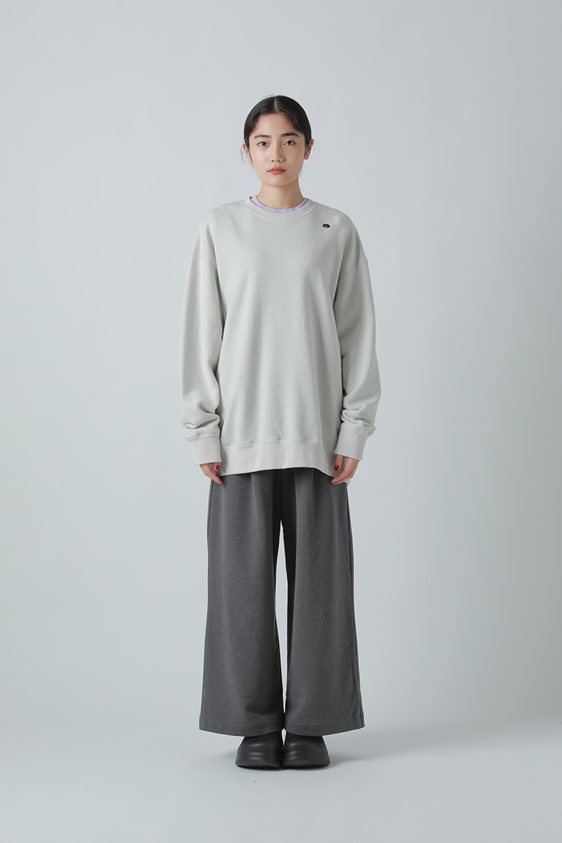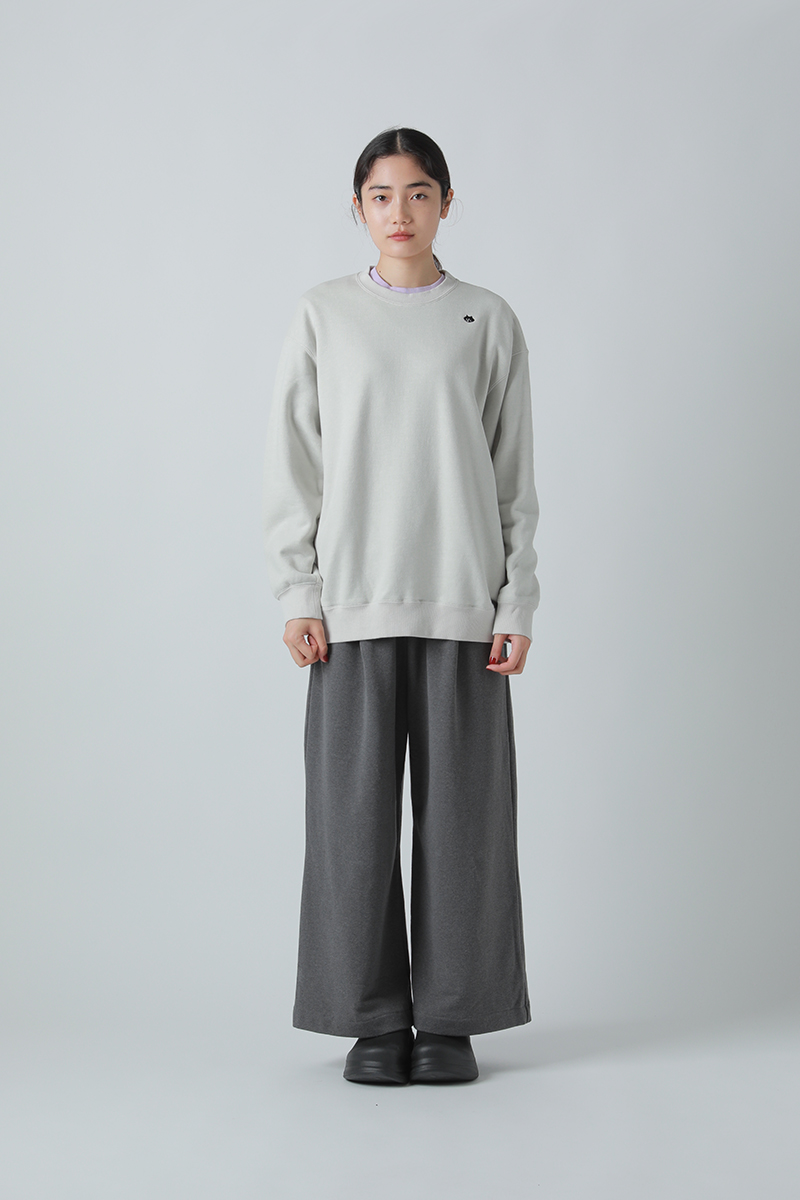 肩の位置をややドロップさせ、ゆったりとしたボクシーな身幅で適度なリラックス感のあるスウェットトップス。