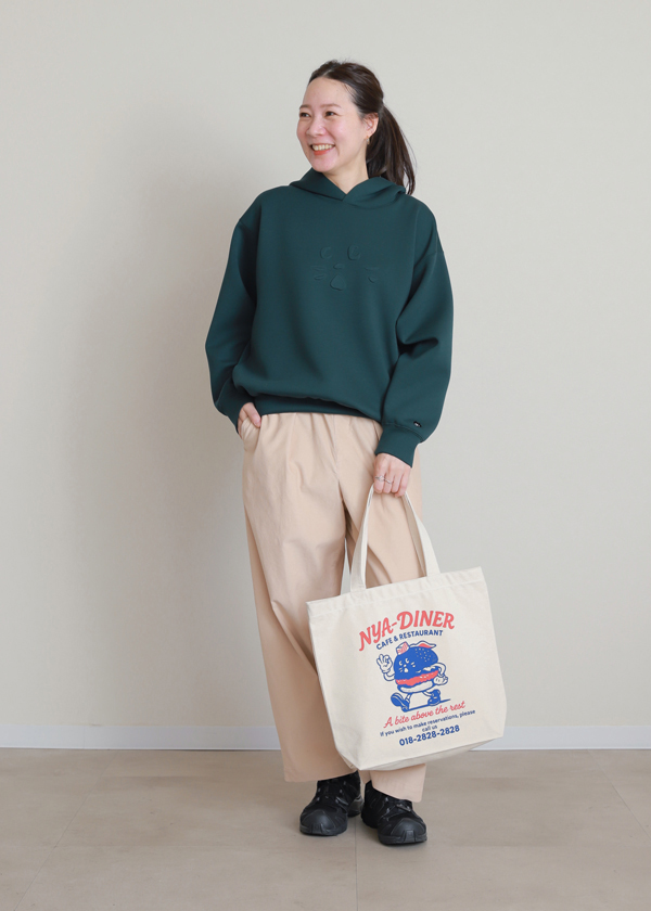 “MERRY CHRISTMAS”とNYA-をキラっとしたグリーンの箔プリントで表現。