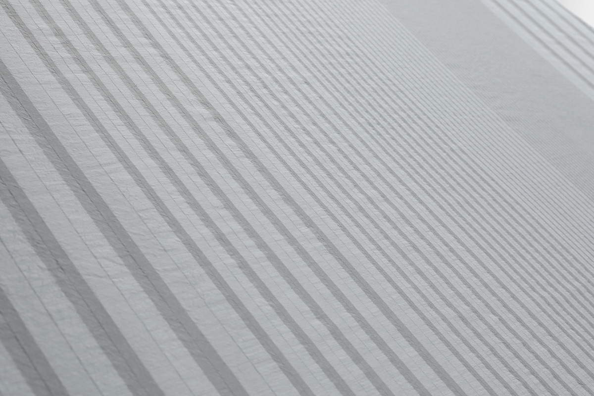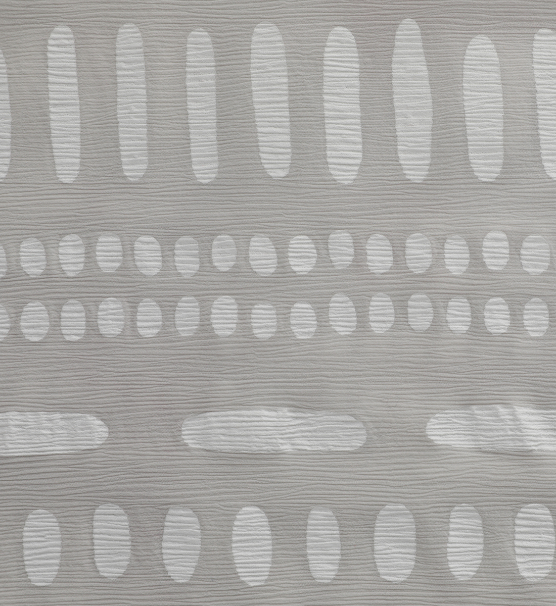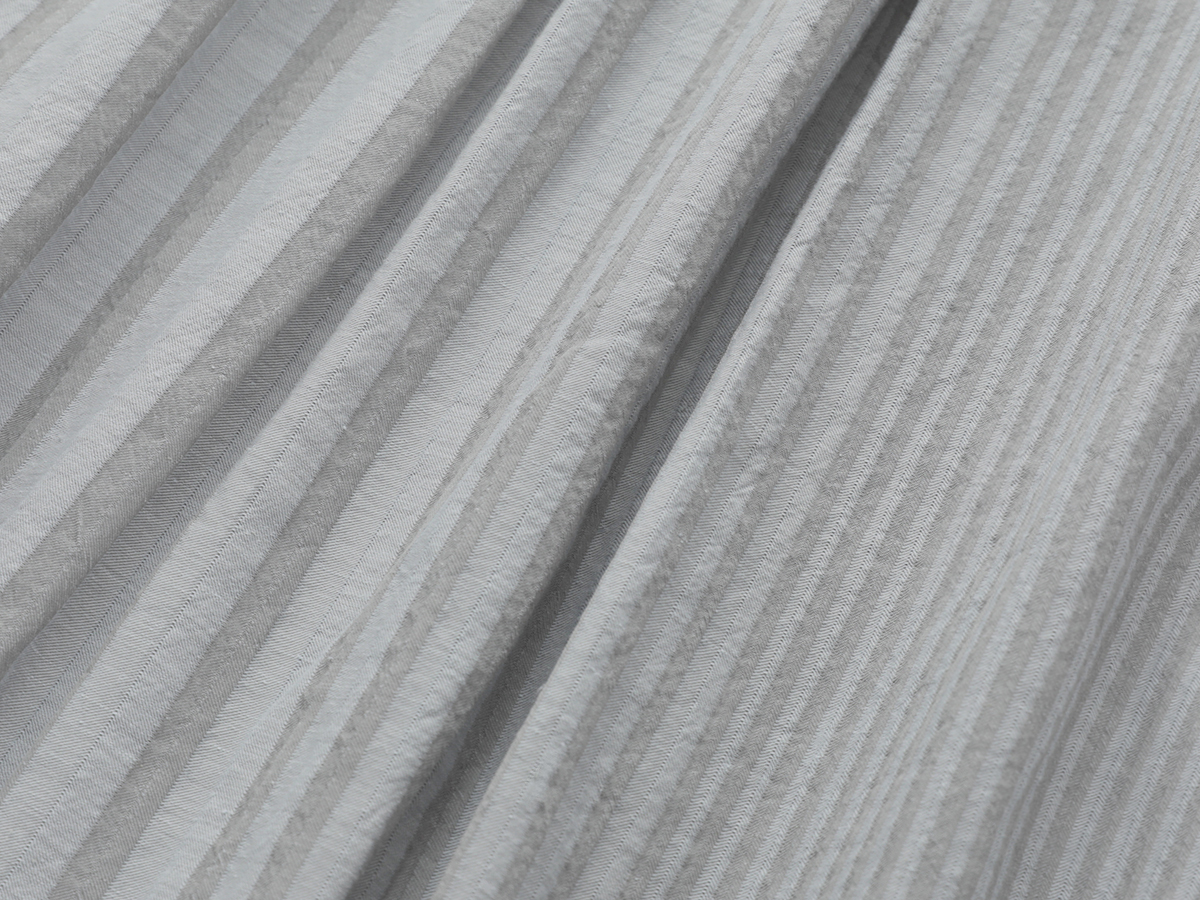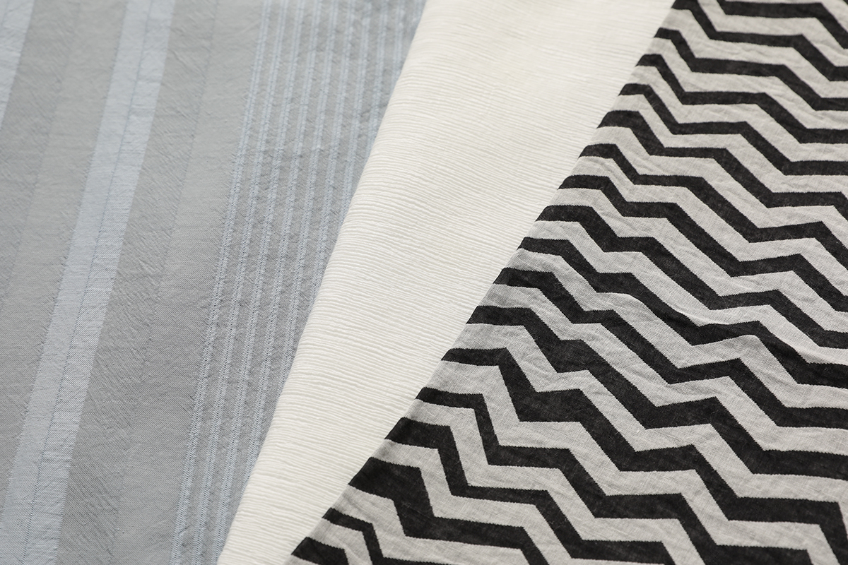 「生地は、縦にコットン糸、横にキュプラを使用し、やや光沢感のある表情に。加えて、グラデーションになったストライプも単純なプリントではなく、組織によるウェーブ状の細かい突起を生かした作りになっているのも特徴です。平面的なプリントと違い、やや立体感のある柄が、日常生活に寄り添いながらも凛とした佇まいになるよう意識しています」(テキスタイル担当者)