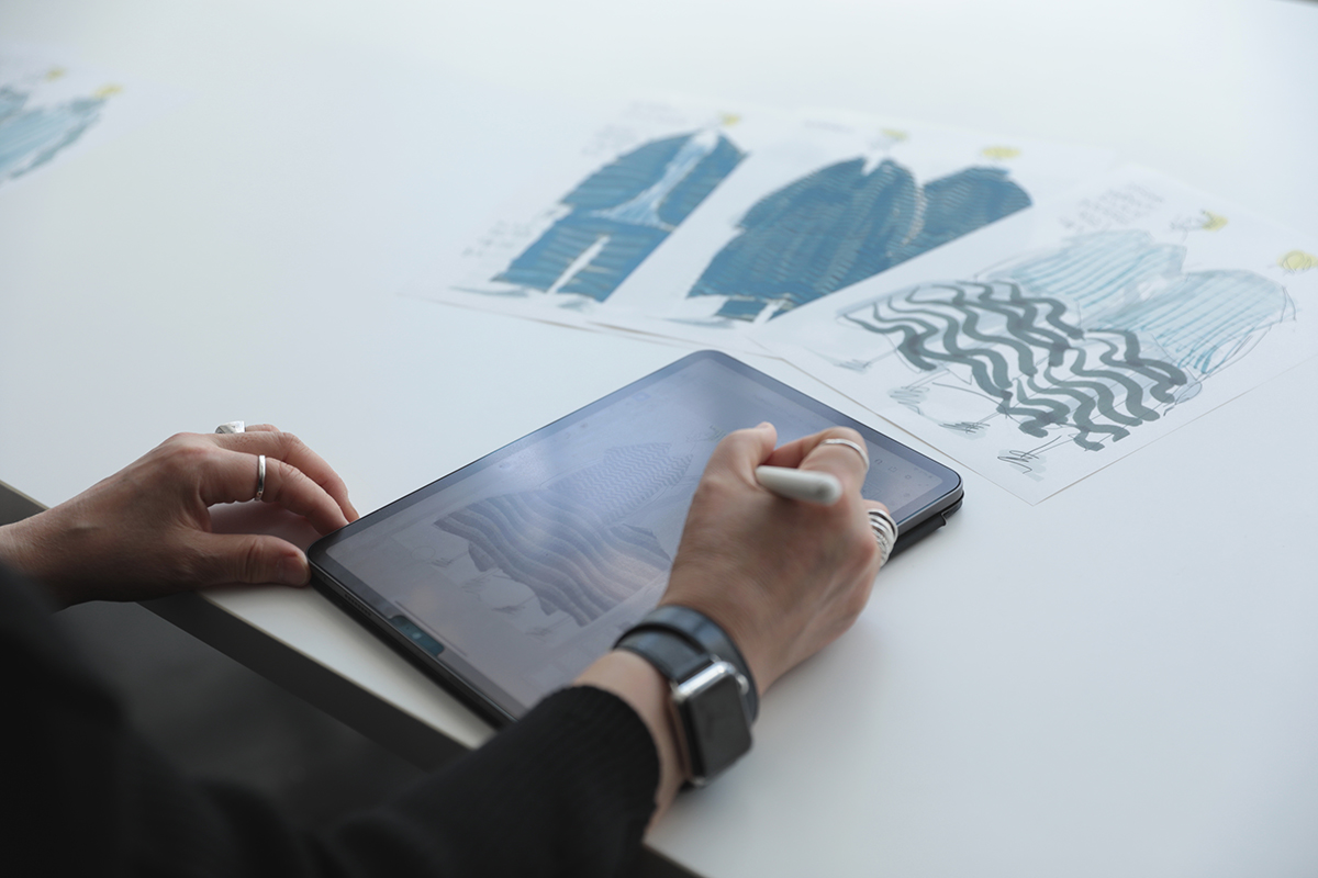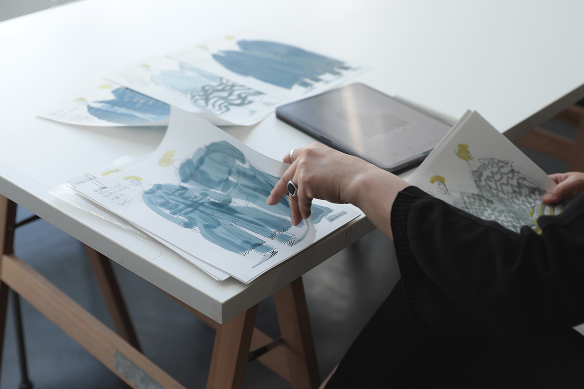 「テキスタイルにおいても、単に図案を作ることだけでなく、製品染めなどの加工や素材との相性、細かい部分で言えば糸の太さなども加味し、イメージをきちんと再現するためのさまざまな知恵や工夫が必要になってきます。そうしたときに、過去の製品はどうだったか、別の素材で作った時にはどうだったかブランドが蓄積してきた経験を振り返ること、また産地の職人の方とのやりとりが重要になってきます」(テキスタイル担当者)