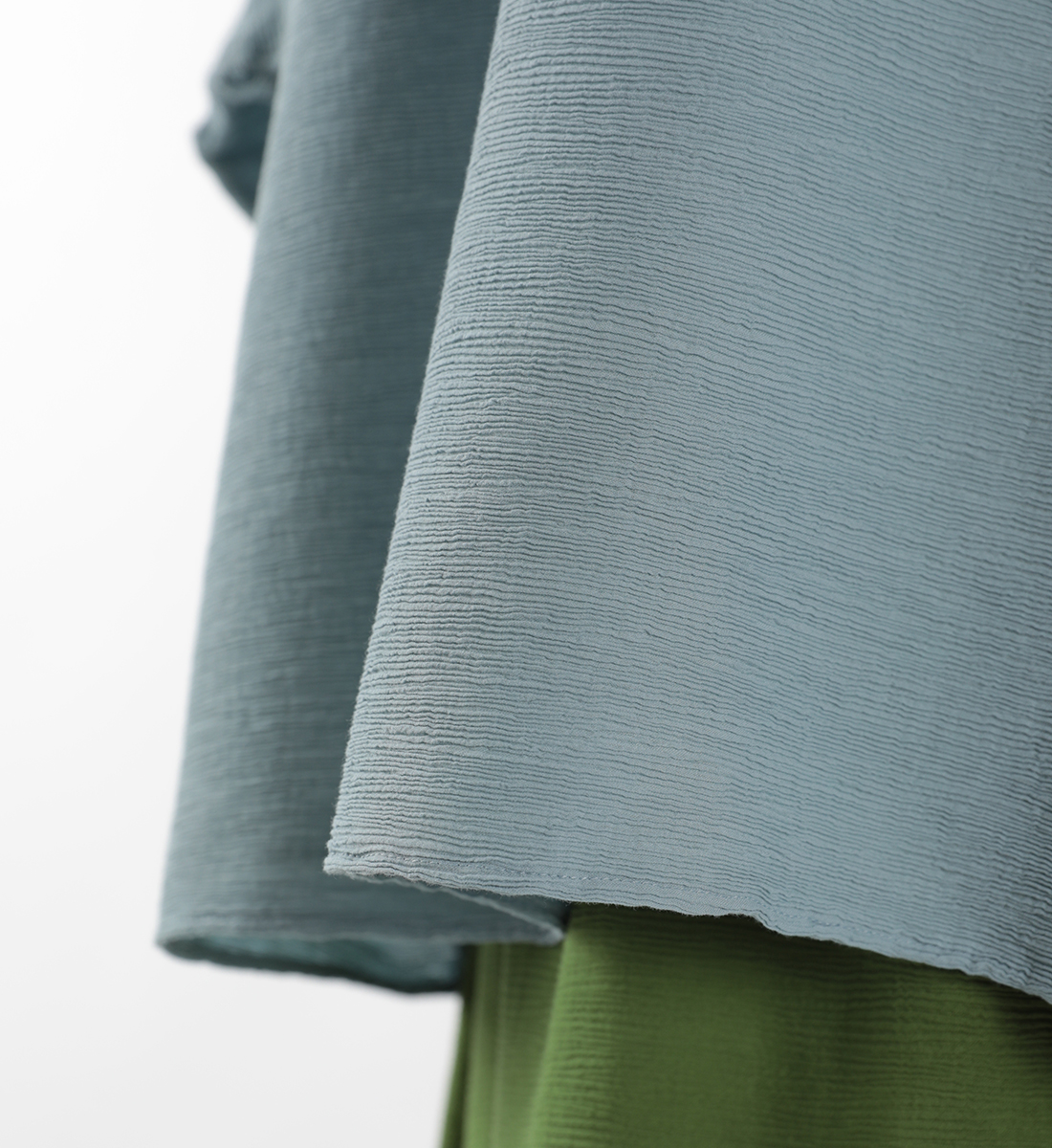 テキスタイル担当者は、「オリジナル柄を顔料でプリントしました。そのプリント部分の少しボコっとした膨らみと、『YOORYUU』の持つシボの立体感が相まって生まれる、独特の風合いもポイントです」と話します。また、「今シーズンは、無地のYOORYUUとも色を合わせているため、オリジナル柄と無地をミックスコーディネイトしていただけるようにも配慮しました」