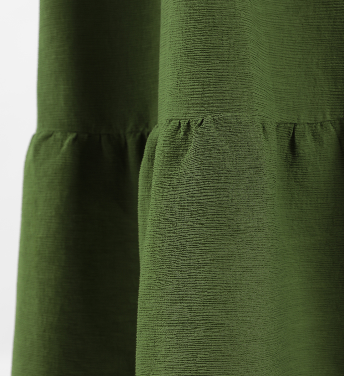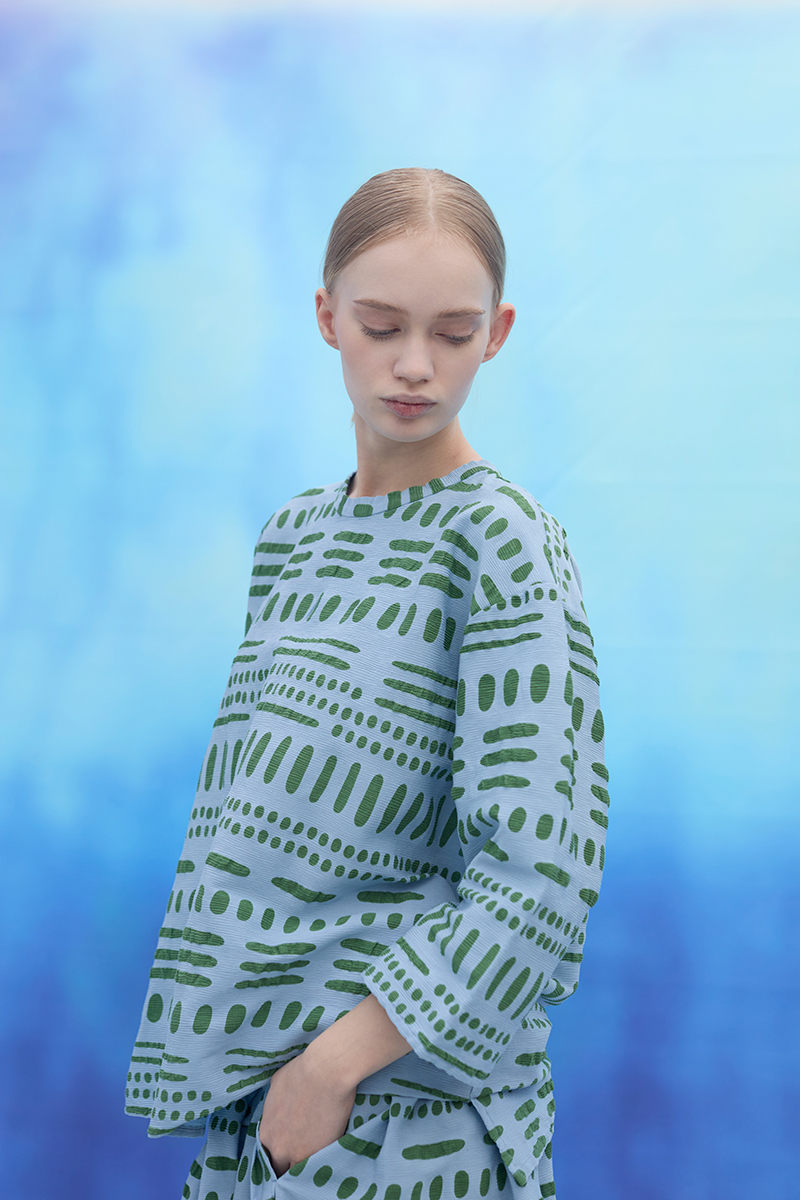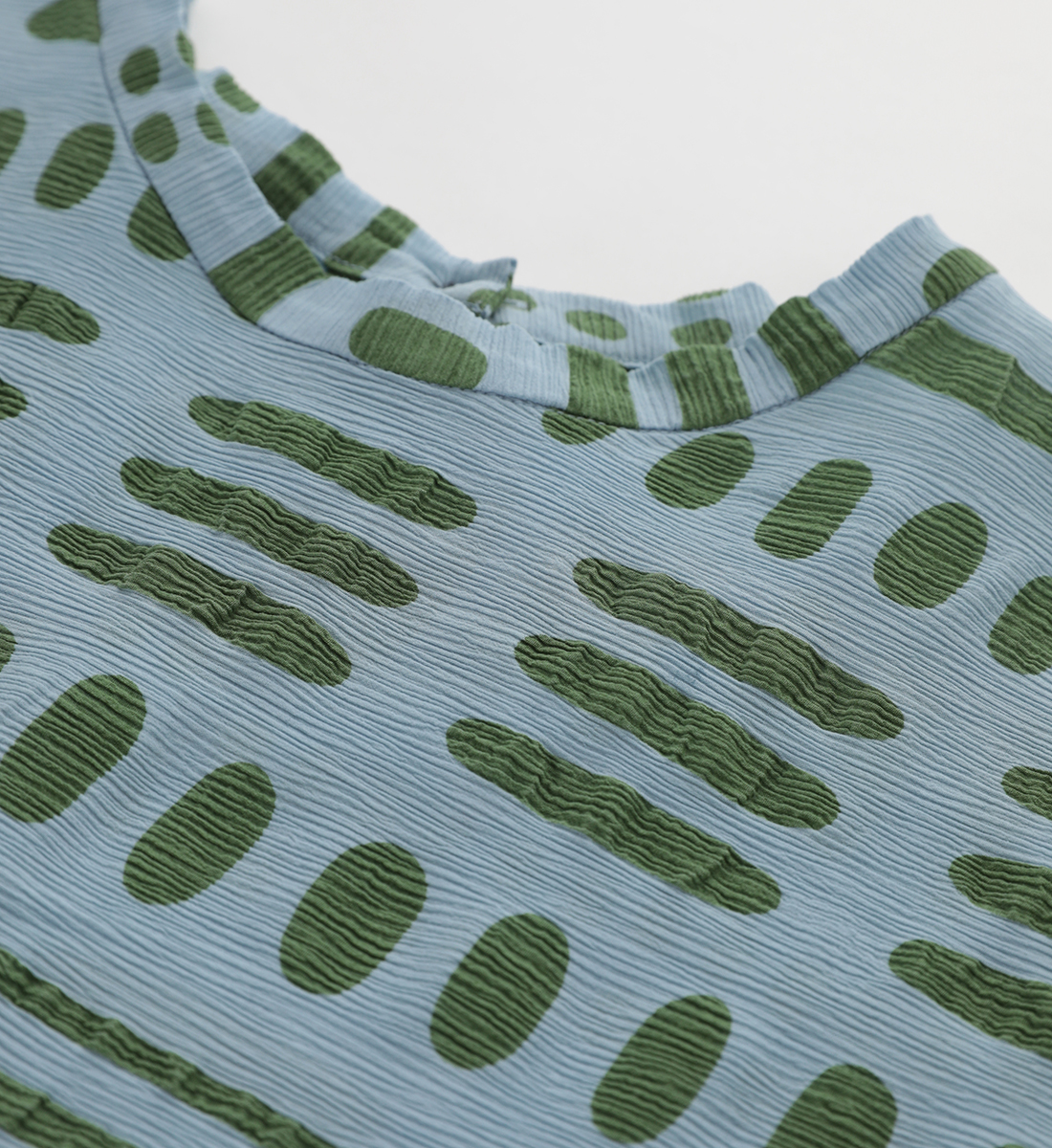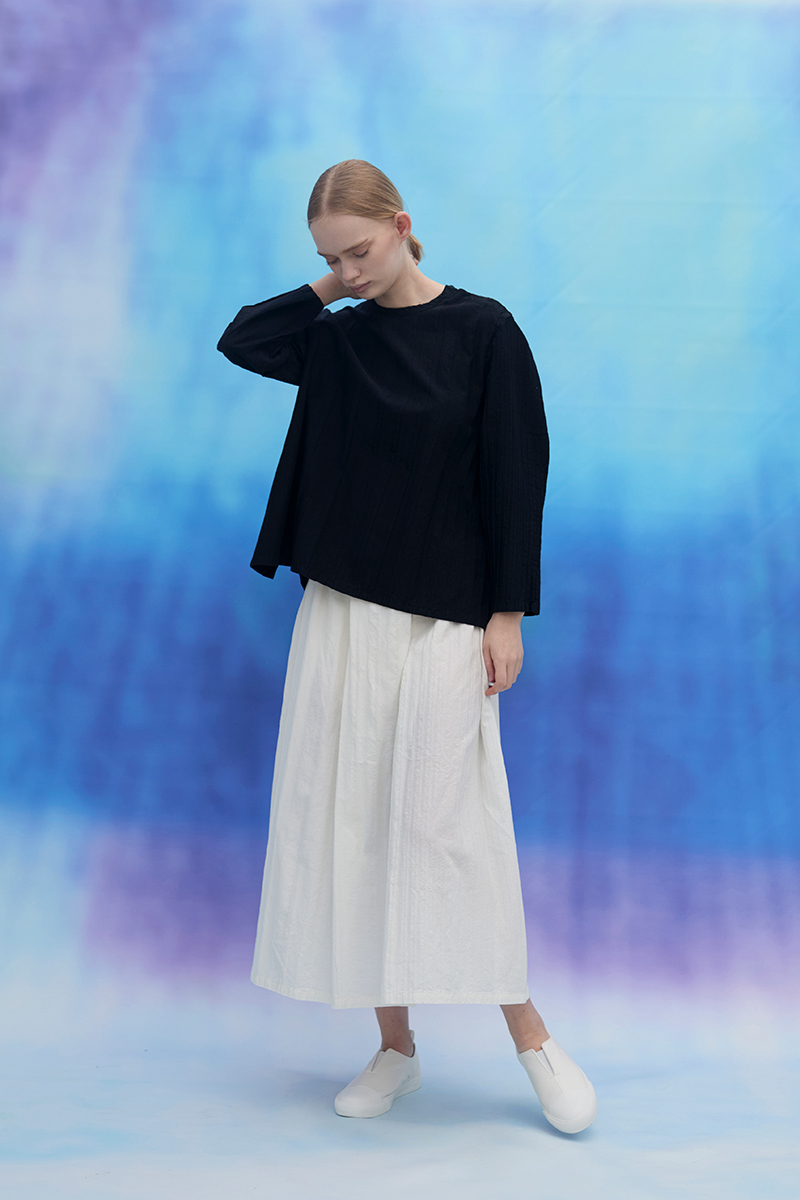 プランテーションの定番素材のひとつ「YOORYUU」の25AW新作には、オリジナルのドットと線の柄を採用したトップスやスカートなどが登場。この「YOORYUU」は、滋賀県高島地域に根付く綿織物「高島ちぢみ」の素材を使用したもので、繊細なシボ感と、それにより肌に触れる面積が少なくなることで実現する涼しい着心地と高い吸湿性が特徴です。
