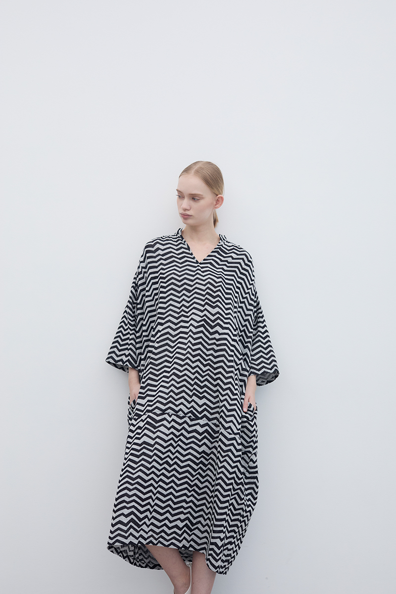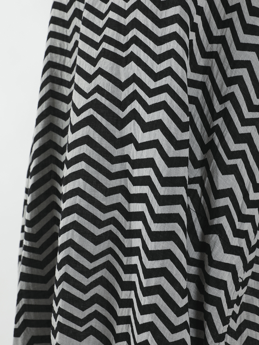 薄くて軽い素材ながら素肌が透けにくい二重織りの「風通ジャガード」のワンピースドレスや、「BIZEN」シリーズの新作も、秋冬コレクションの立ち上がり時期のおすすめアイテムです。「ジャガードのワンピースは、ギザギザと波打つ、連続した線の中にズレと歪みを加えることで、柄の中に没入するような視覚的な感覚もお楽しみいただける1枚です」とサトウ。テキスタイル担当者も「こうした柄はジャガードの織組織、つまり縦糸と横糸の交わり方によっても表現されており、プリントとはまた違う風合いもその魅力」と言います。