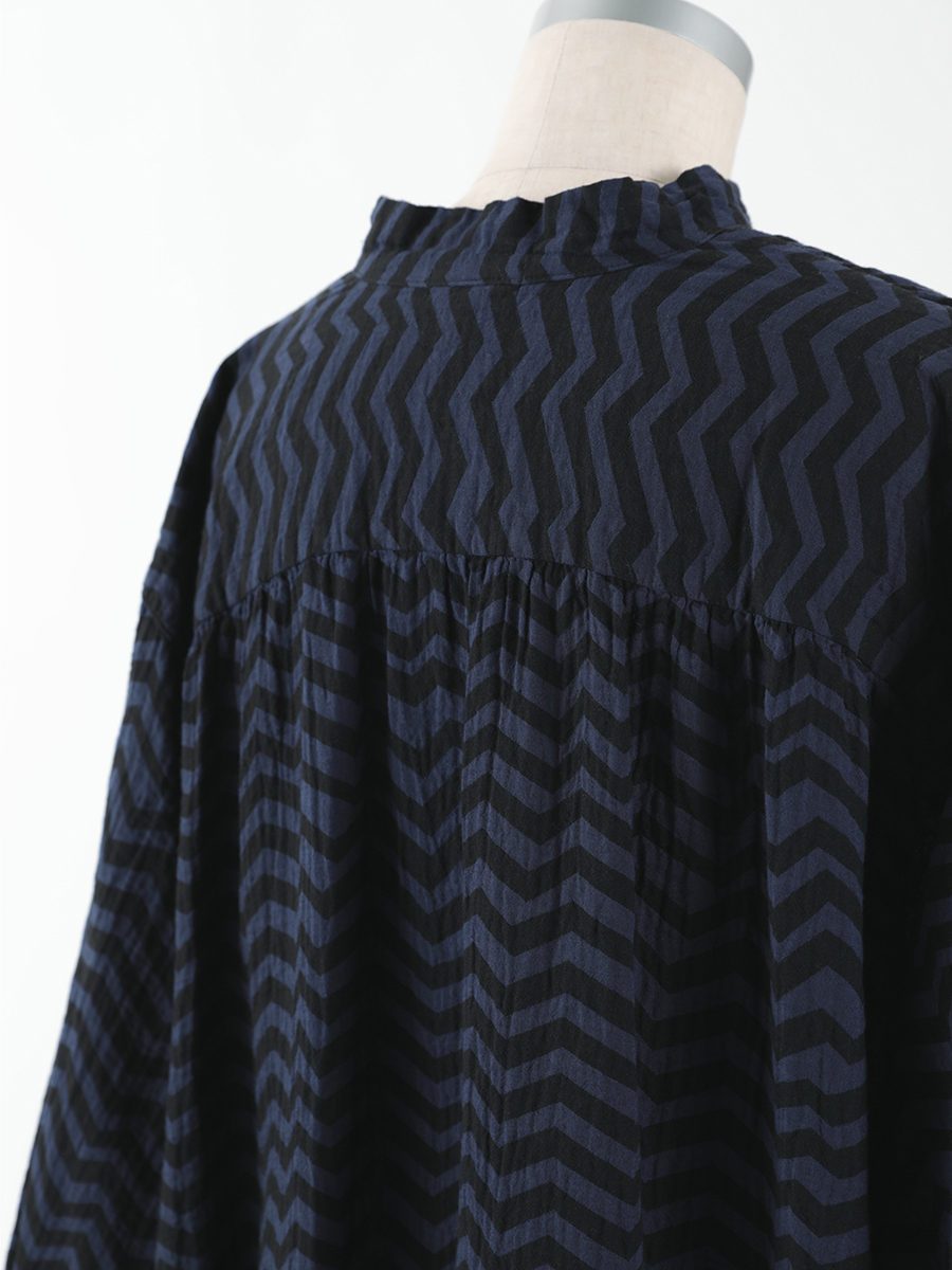 「もともと『高島ちぢみ』を使用した商品はシボが縦地になるように使うことが通常ですが、プランテーションでは発想を転換し、横地にして使っています。そうすることで、ハリ感とプリーツのような弾力性が引き立ち、より肌離れの良い着心地が生まれるからです。加えて、着用時、シボがバネのように伸び縮みし、リズミカルな動きをもたらしてくれます。そうした立体的でモダンなシルエットと、柄のバランスも楽しんでいただければ」(サトウ)
