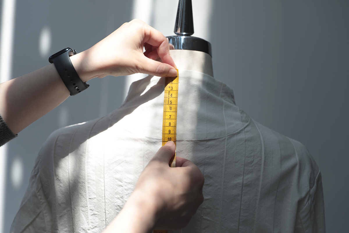 「YOORYUU」は、天然繊維を織組織の組み合わせや加工によって伸縮させ、独特の風合いを生み出した素材。温度や湿度などその環境によってもその伸縮は変化し、まるで生き物のようだとも言われます。パターンを担当する技術担当者は「だからこそパターンも、素材やアイテムによってアレンジしながら、ひとつひとつ丁寧に仕上げています」と製作秘話を話します。「特にYOORYUUは伸縮率が大きい素材。プリントした部分と無地の部分で縮み具合も変わり、さらに色の濃さ、顔料の濃度もそうした伸縮率に影響します。そのアイテム、柄に対して最適なパターンを探りながら、ベストなものをお届けできるようにじっくりと時間を使って作っています」