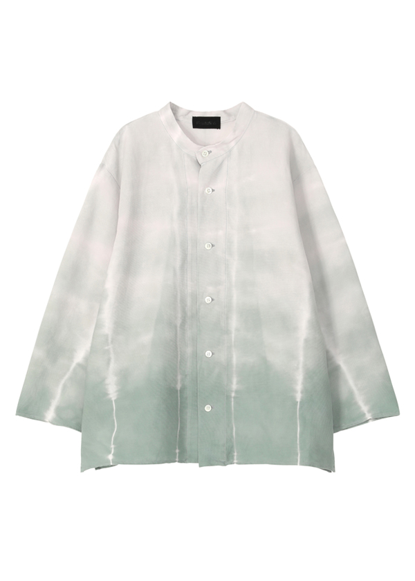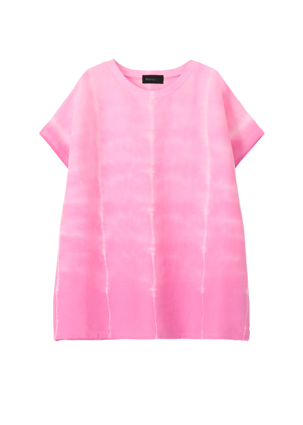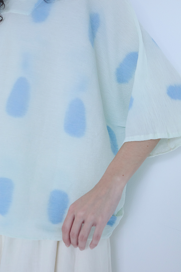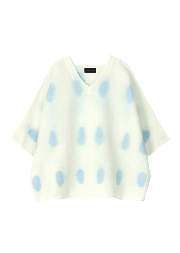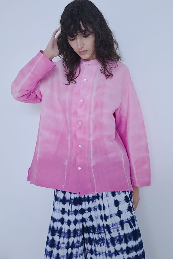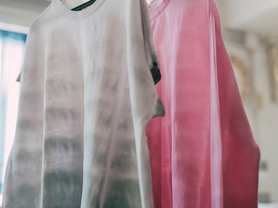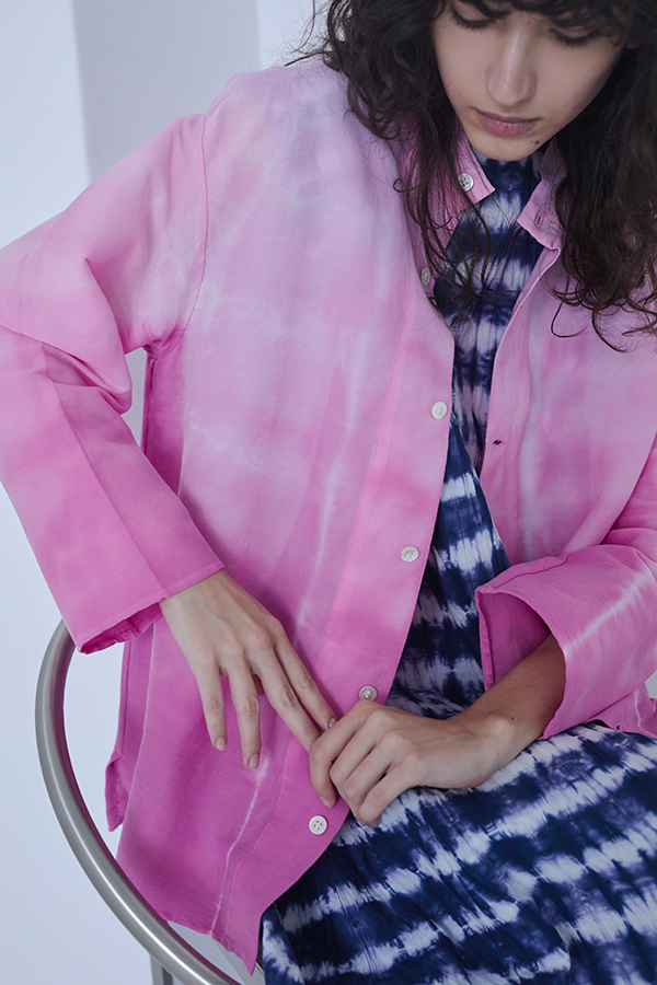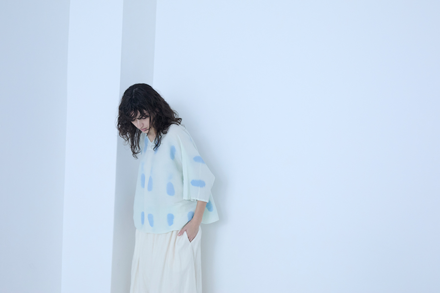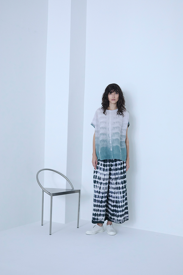「YOORYUU T」には、「ラハリア(波)」と呼ばれる巻き絞りで柄を載せました。これは、生地を何重にも巻き込み、染料の浸食具合で色の濃淡を表現するシンプルな技法で、今回表現したのは、服の袖からネックまで自然に流れるようなグラデーション。伝統技法ながらも、和服っぽすぎないこの色柄を用いることで、横地にシボを配置しバネのように張りのある「YOORYUU T」に新鮮な表情を与えました。