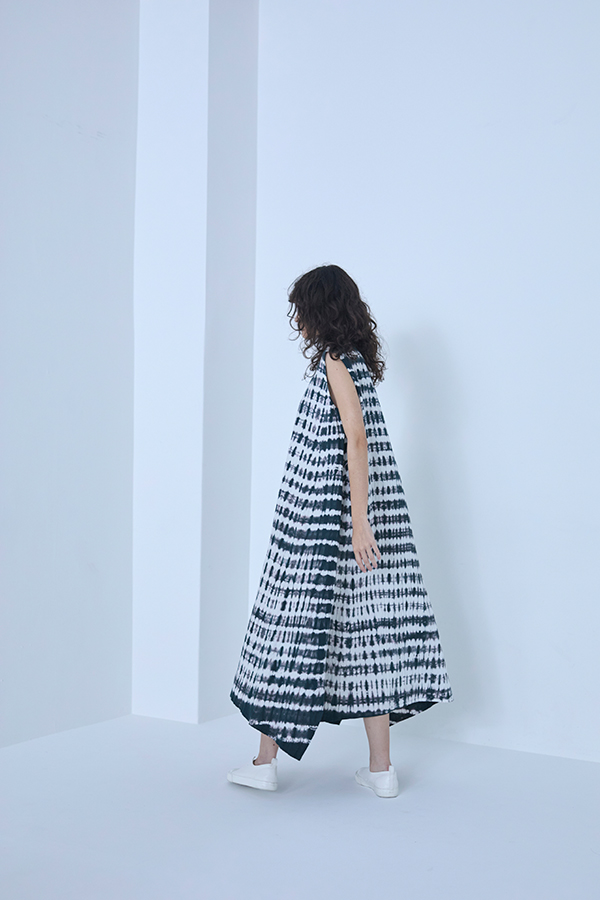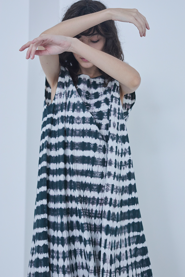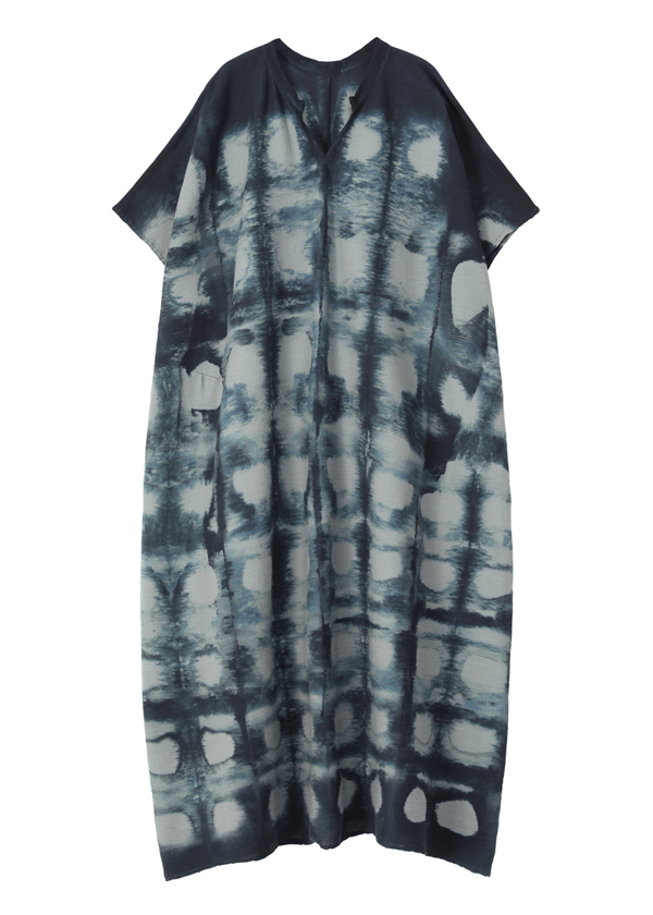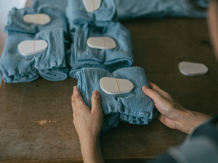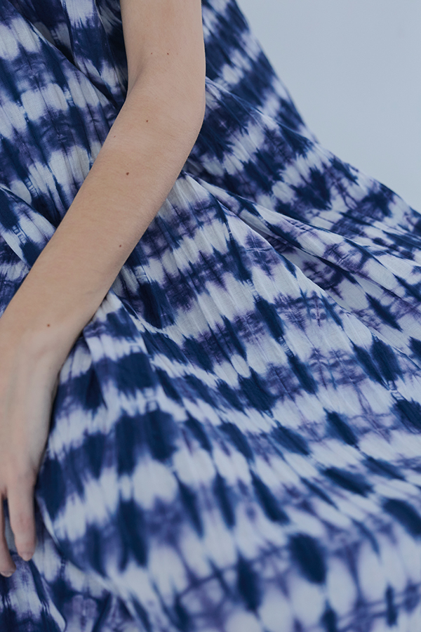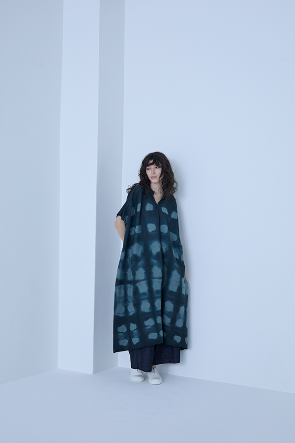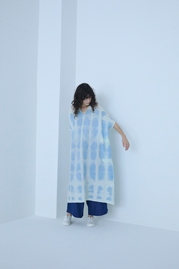 「YOORYUU」のプルオーバーブラウスとワンピースには、同じく有松絞りを代表する絞りのひとつである「板締め絞り」を施しました。「板締め絞り」は、何重にも折りたたんだ生地を型板で挟んできつく固定し、その部分を防染することで連続的な紋様を生み出す技法。それぞれブルーとチャコールグレーに製品染めを施した「YOORYUU」に「板締め絞り」を施し、ブルーは板締め以外の箇所を抜染(脱色)し、チャコールグレーは板締めしたものの上から更に染色を施すオーバーダイ加工を行っています。ブラッシュペイントにも似た大胆な色面の連続性が、生地の分量の多いワンピースやカットソーに美しく映えます。