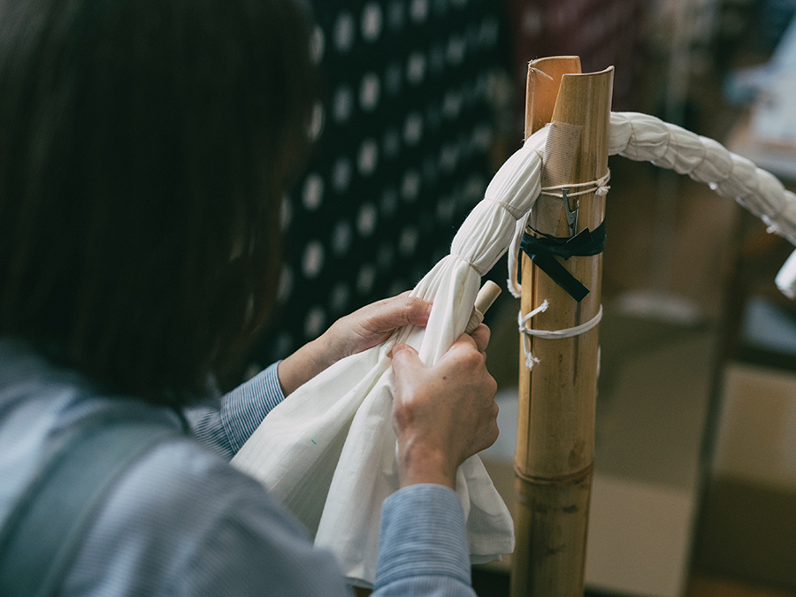 「鎧段絞り」では、まずひだを作るように折り込みながら、一定の間隔ごとに紐で括り上げ、生地を筒状に。その後、紐と紐の間隔をギュッと押し縮めることでできた生地の膨らみが染色部分となり、ボーダー状の段模様が現れます。