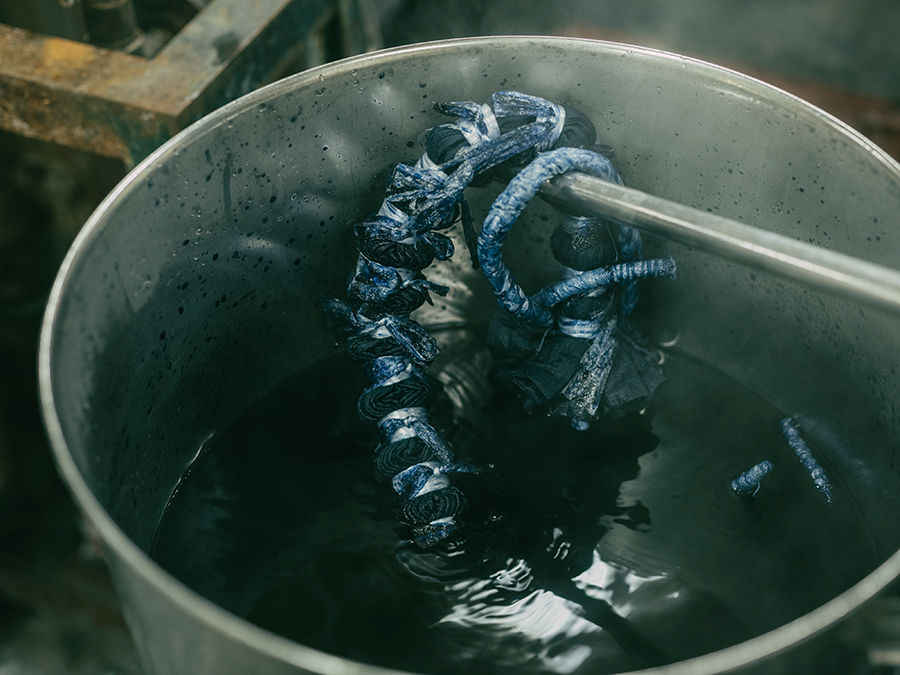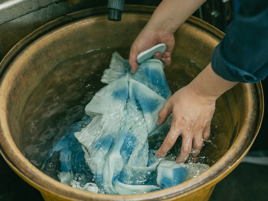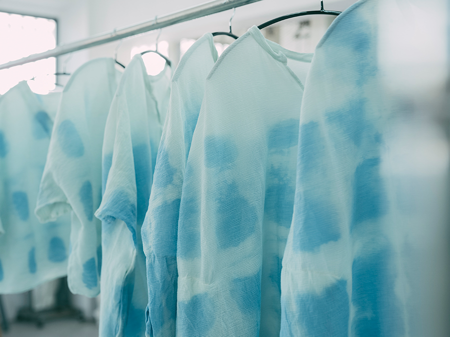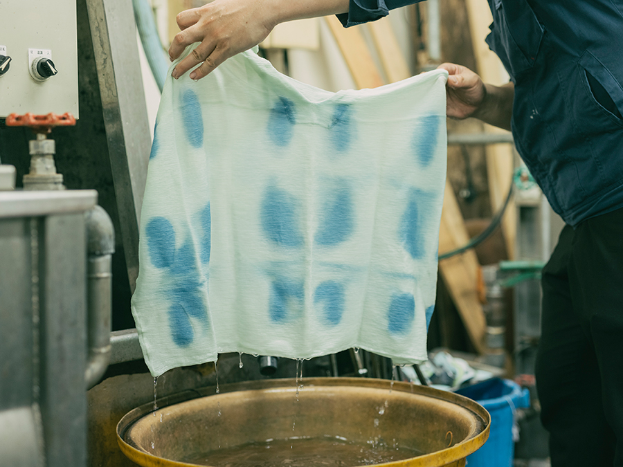 今回は、すべて縫製され服になった状態のものを染めていく「製品染め」。五代目の久野浩彬さん曰く、加工を施した際の生地の伸縮、また着用時に柄がどのように現れ出るかを想定し、職人がひとつひとつ衣服を絞り、最適な濃度と時間、またその配合を計算しながら染め上げていったと言います。