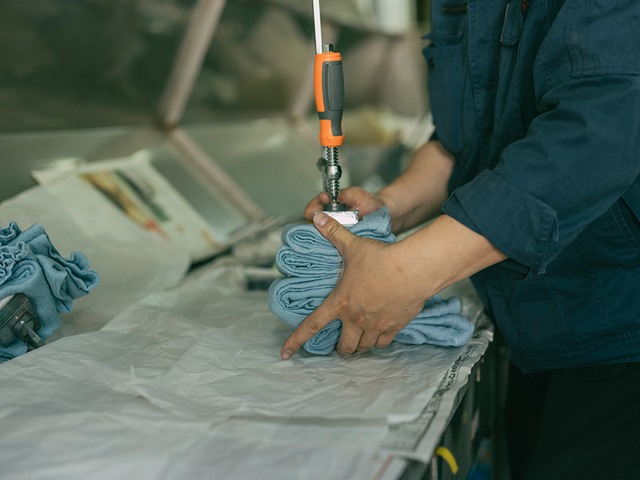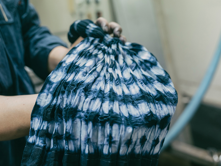 今回、コラボレーションした「絞染色 久野染工場」は、その中でも100年以上の歴史を持つ有松絞りの老舗。伝統工芸士の久野剛資さん(四代目)、久野浩彬さん(五代目)を中心に職人たちの手仕事を継承しながらも、和服用のテキスタイルだけでない現代のスタイルに合う有松絞りの可能性を開拓してきました。