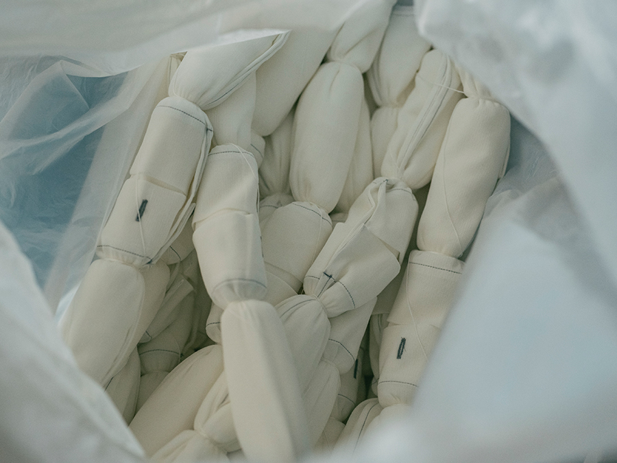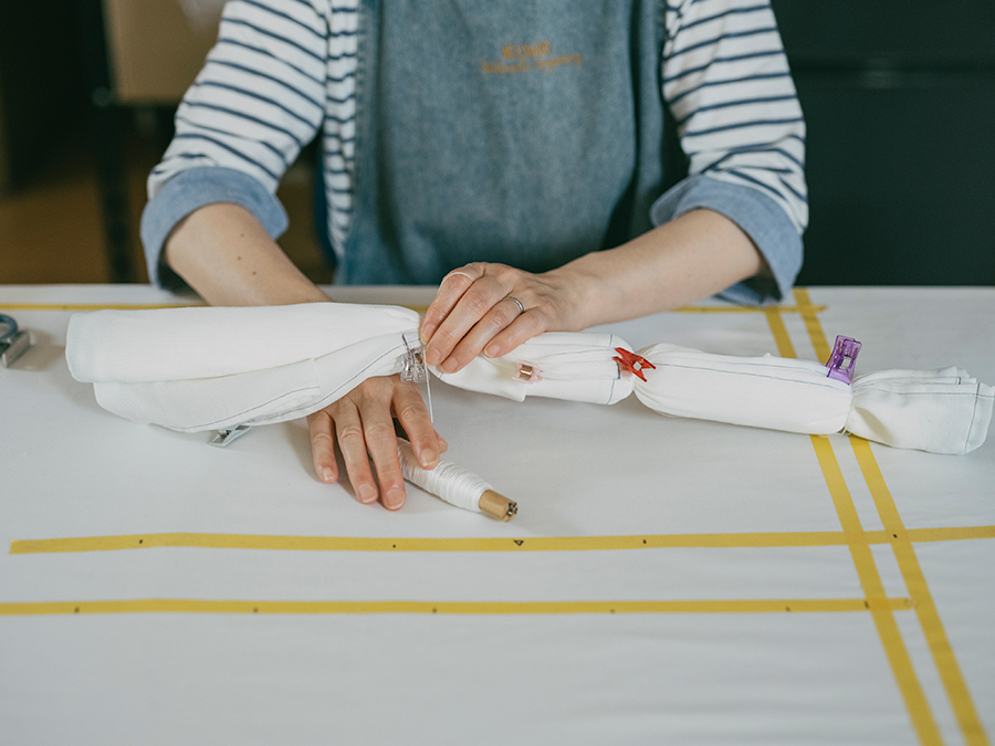 「日本の伝統的な手仕事で絞り染めを継承している土地はあまり多くない中で、久野染工場はその伝統を大切にしながらも、素材的にも技法的にも革新的なことに挑んでこられた作り手。テキスタイルを学びにここにやってくる若い作家も多いと聞きます。一緒に取り組むことで、絞り染めという手仕事の魅力を未来に繋げられたらと考えたことが今回のコラボレーションのきっかけのひとつです」とデザイナーのサトウは話します。