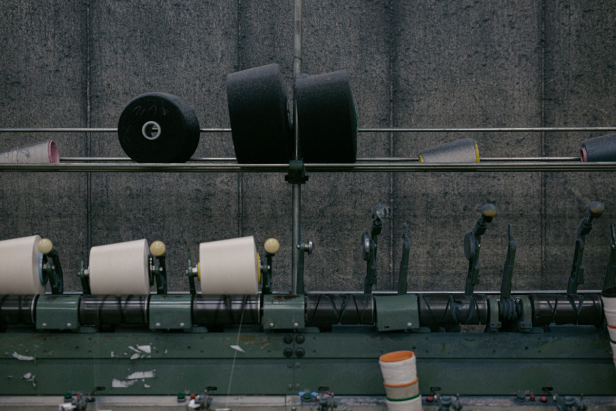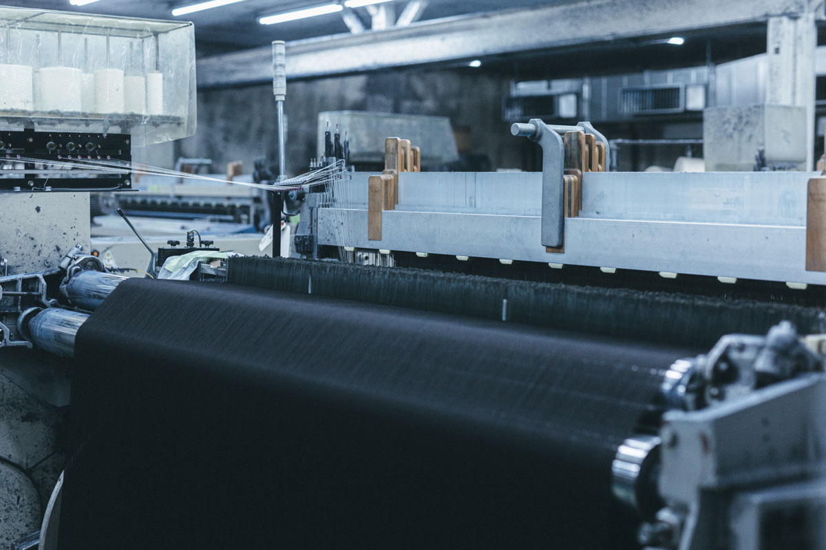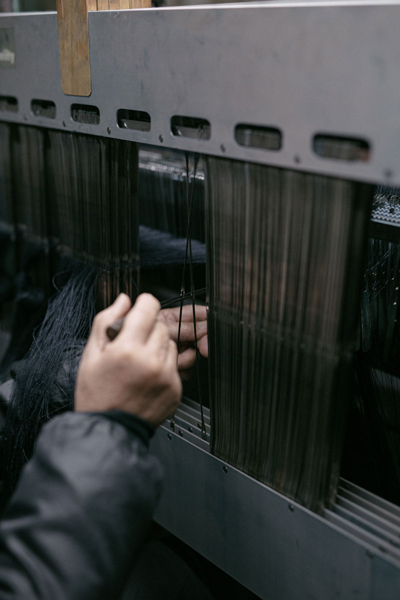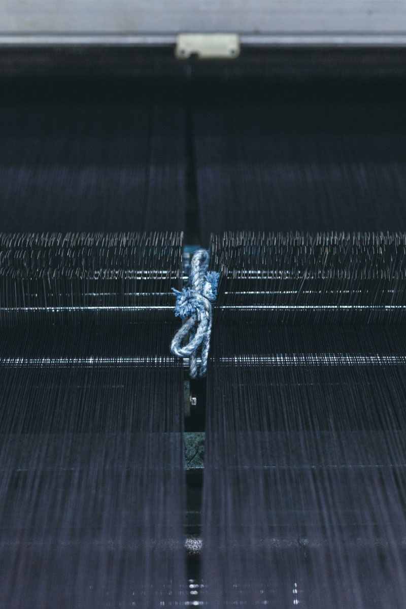 一度インディゴの糸を使ってしまうと、織機にインディゴの色が残ってしまい他の糸を使って織ると色が付いてしまいます。そのため、デニムジャガード織機はあまり多くありません。