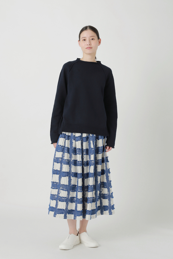 カットジャガードで表現した大胆なチェック柄がコーディネートを華やかに彩ります。