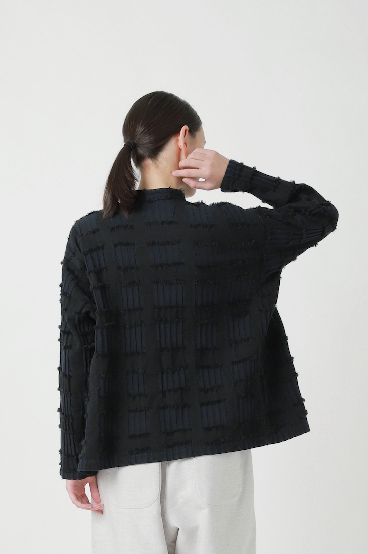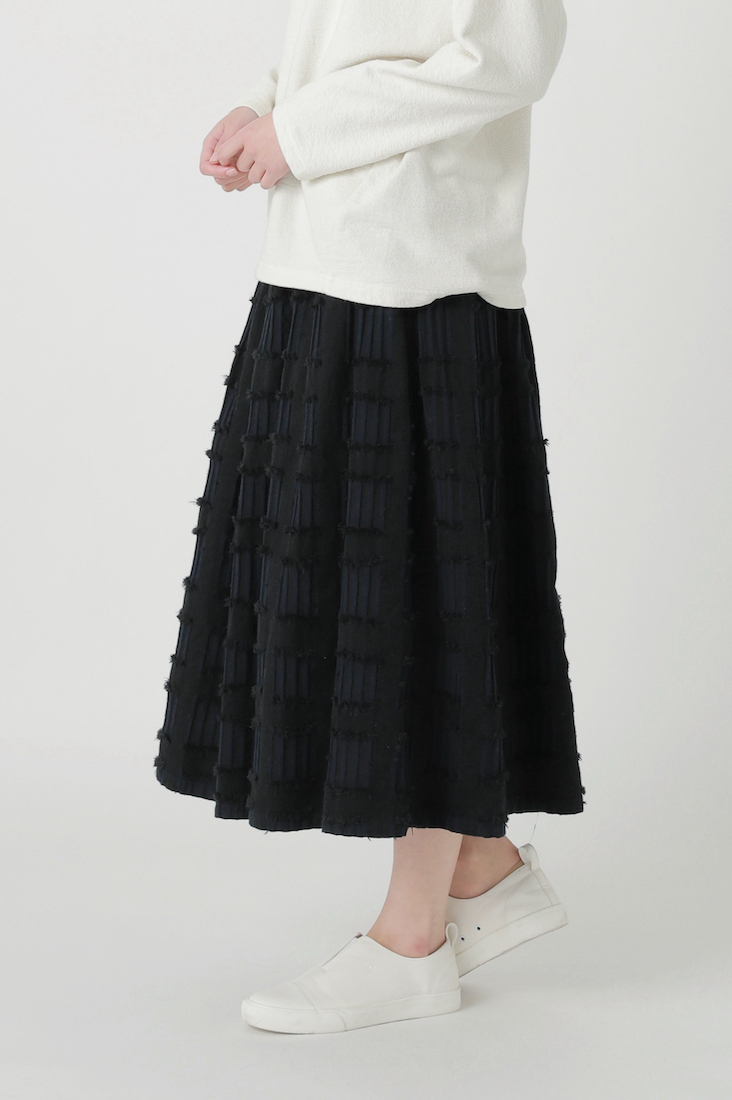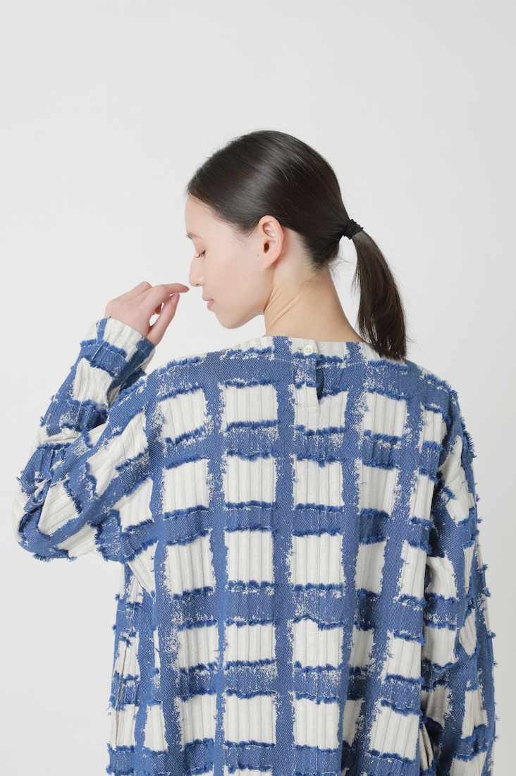 そのベース生地にカットジャガード織機で柄をのせ、仕上げに糸をカットすることで手書き風のチェック柄を表現しました。