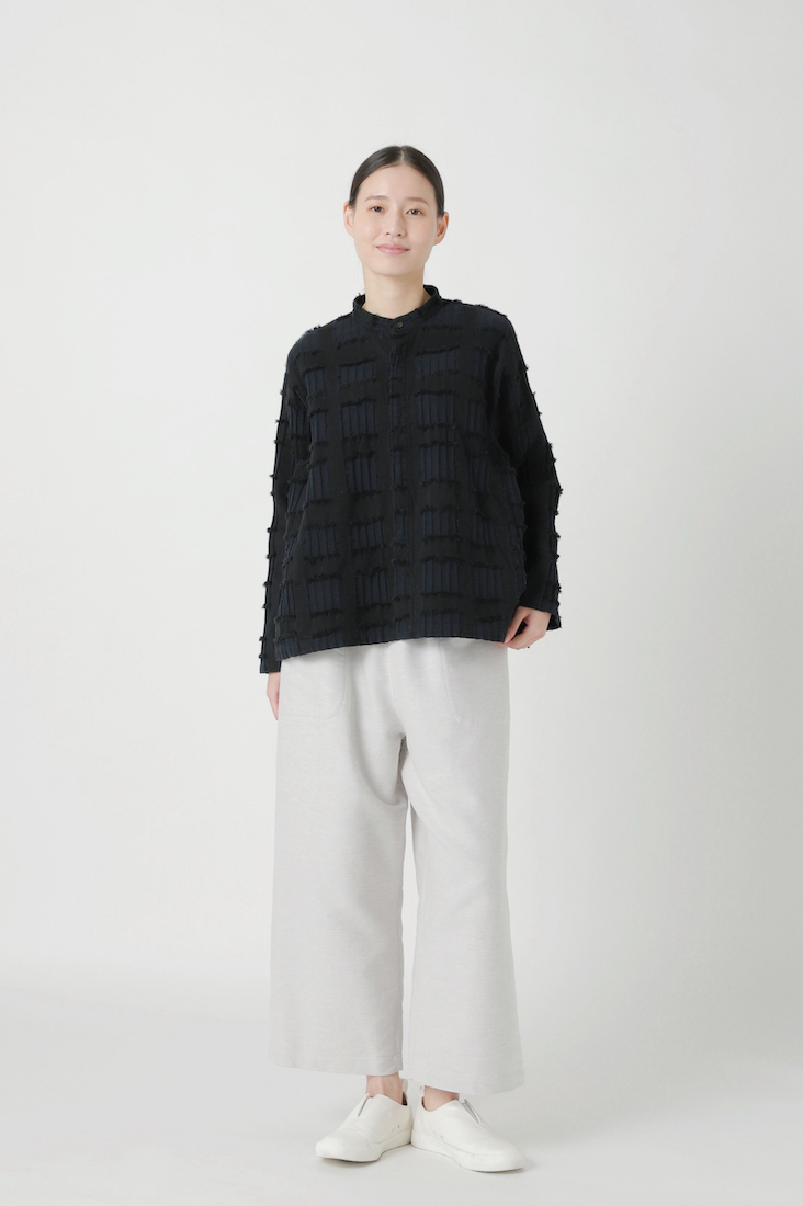 首元は着脱しやすい後ろボタンで、さらりと一枚で着てもパンツを重ねてもバランスがとりやすく