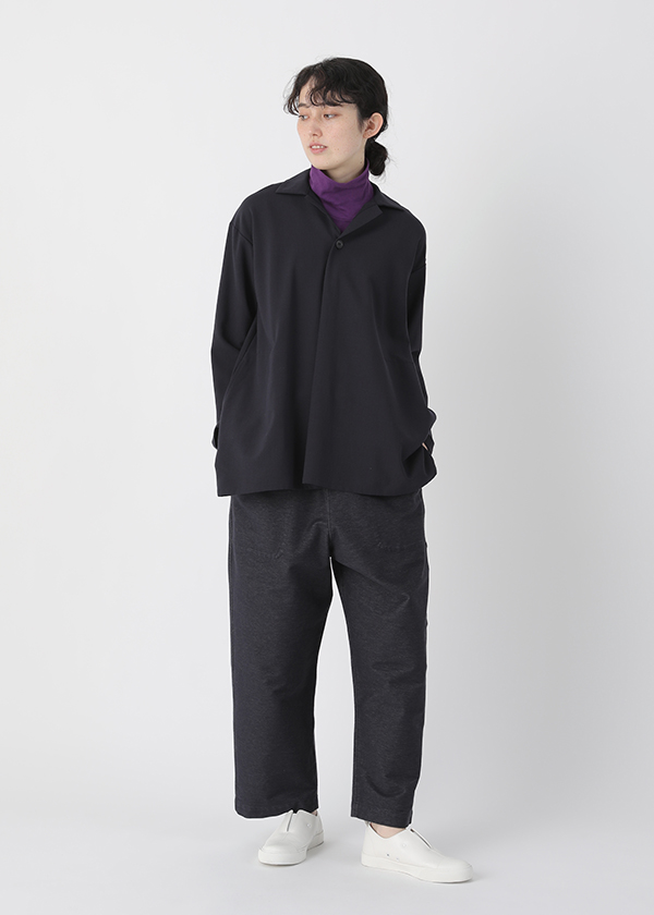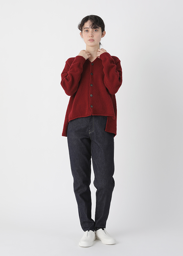 ニット素材でつくることで他にはない優れたストレッチ感で着心地楽々。その名も「RAKU(ラク)デニム」。インディゴではなく反応染めの糸を使って色落ちしにくくし、購入時の色を長く楽しめるようにした独特なマット感のある大人デニム。
