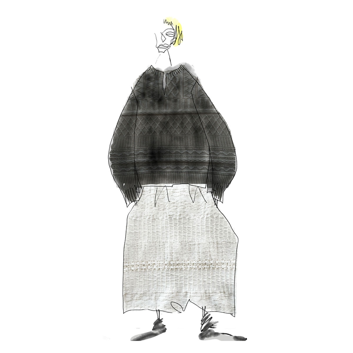 麻ライクな清涼感とシャリ感を持った和紙ベースの糸をリリヤーンにすることで、立体感がありながらエアリーな軽さを出したニットです。ボトムにBIZENガンジーWAVEのスカートをコーディネートすることで、ニットと織物とで異なる凹凸の表情の違いが体感出来るのが魅力です。