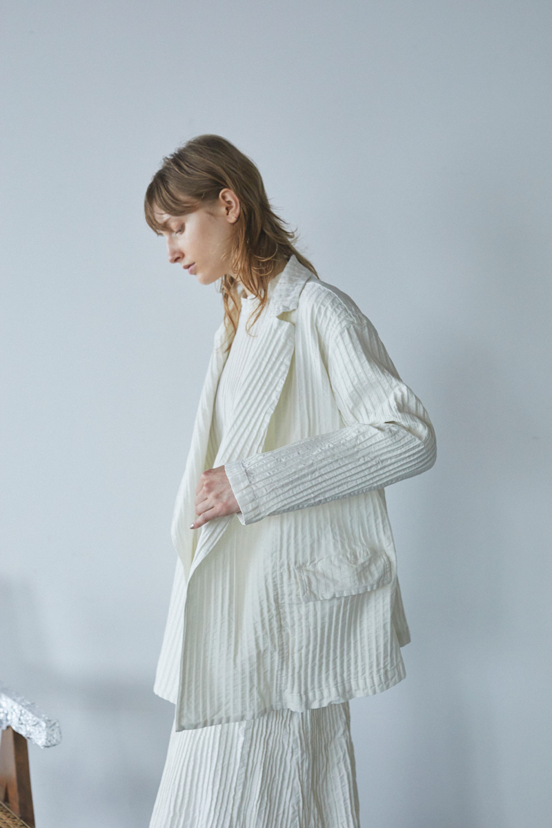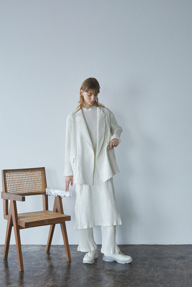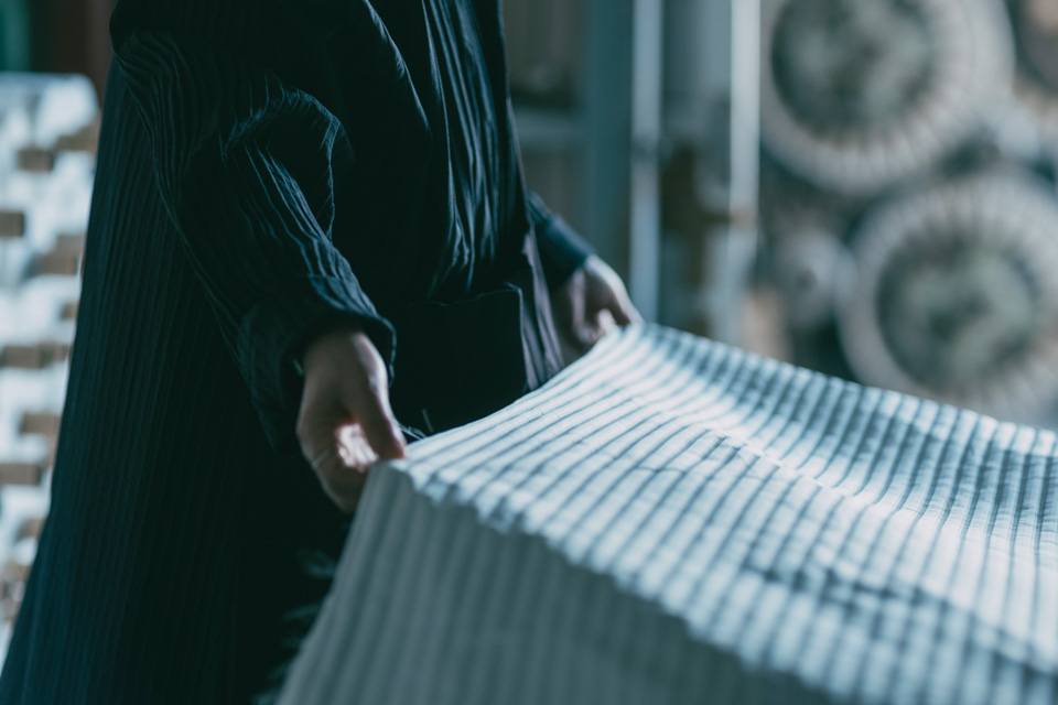 「ECO WAVE」の最大の特徴は、波のように揺らめく独特な織り組織です。この素材は、織りの組織そのものでWAVEを表現しているため、プリーツ加工のような型で熱を用いて行う加工とは異なり、自然な表情を持っています。