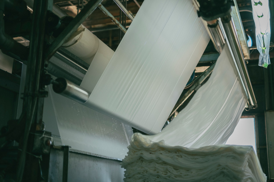 「ECO」シリーズが誕生した北陸の織物産地には、明治時代から続く確かな技術が息づいています。その伝統を受け継ぎながら、現代のニーズに応える新しい素材開発に挑戦する職人たち。彼らの手仕事があってこそ、プランテーションの特色あるテキスタイルが生まれています。