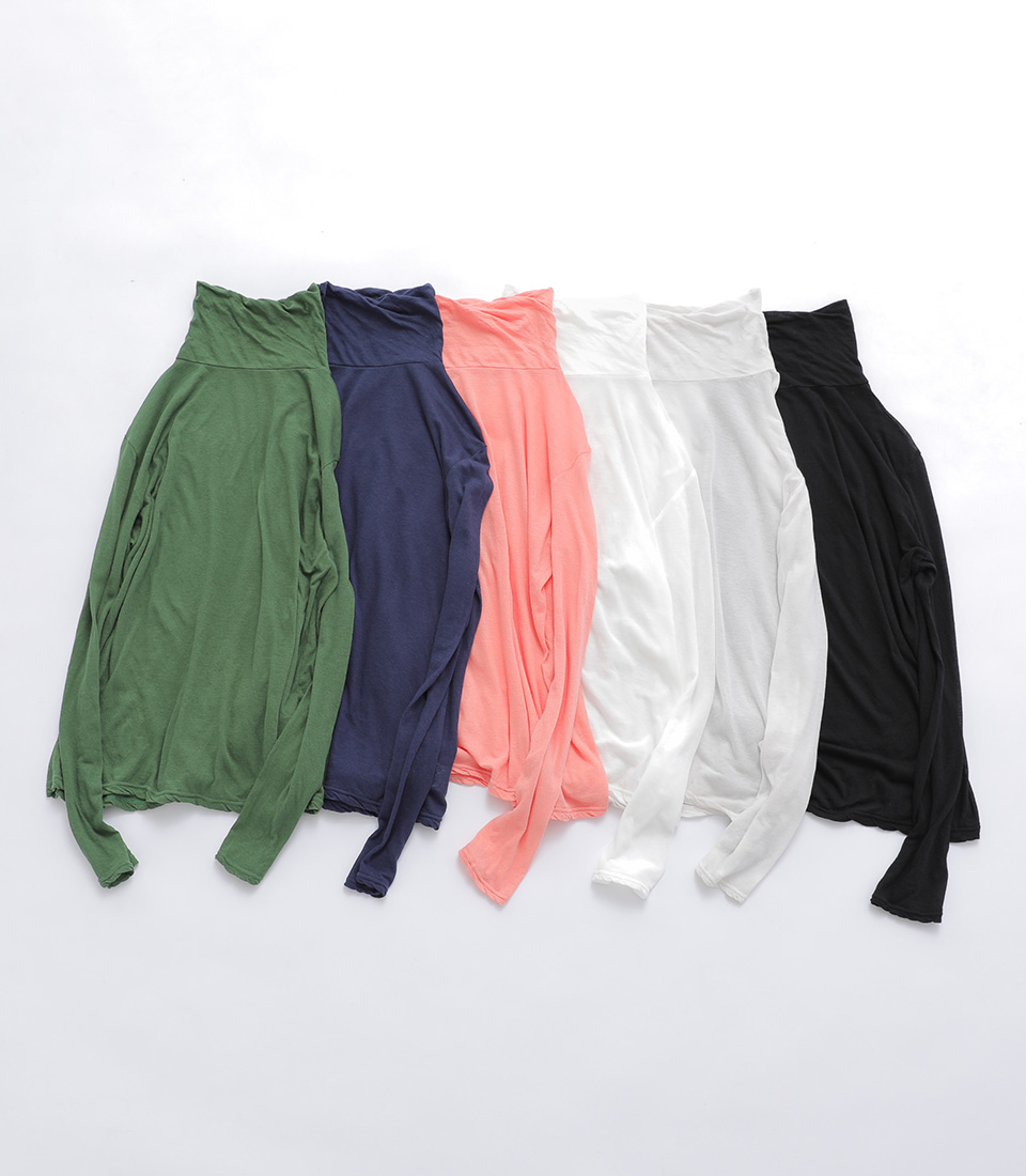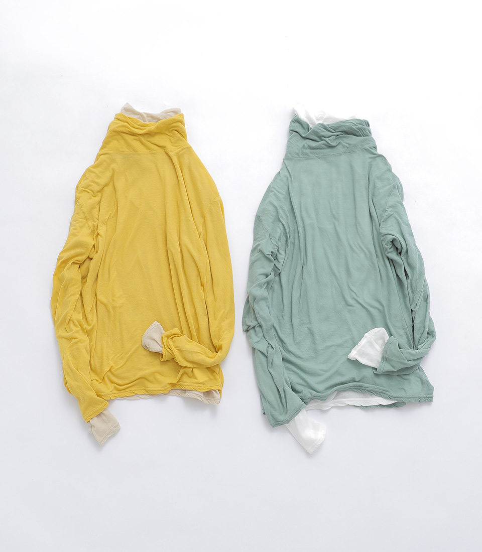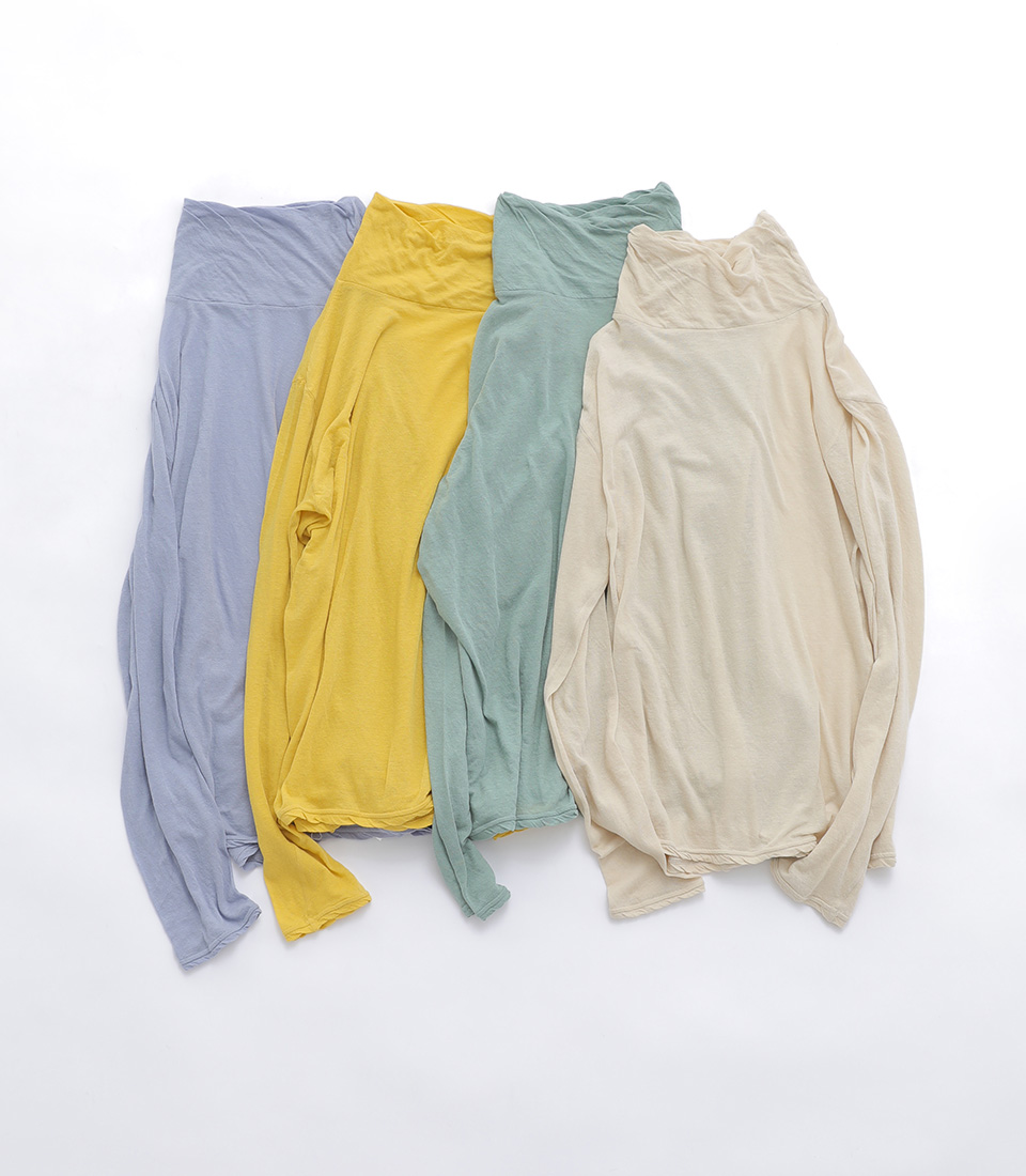 1枚では羽のように軽く薄いインナーとして、2枚重ねて着ることで透けることもなくあたたかくすごしていただけます。色違いのエジプトコットンを重ねてレイヤードスタイルを楽しむのもおすすめです。