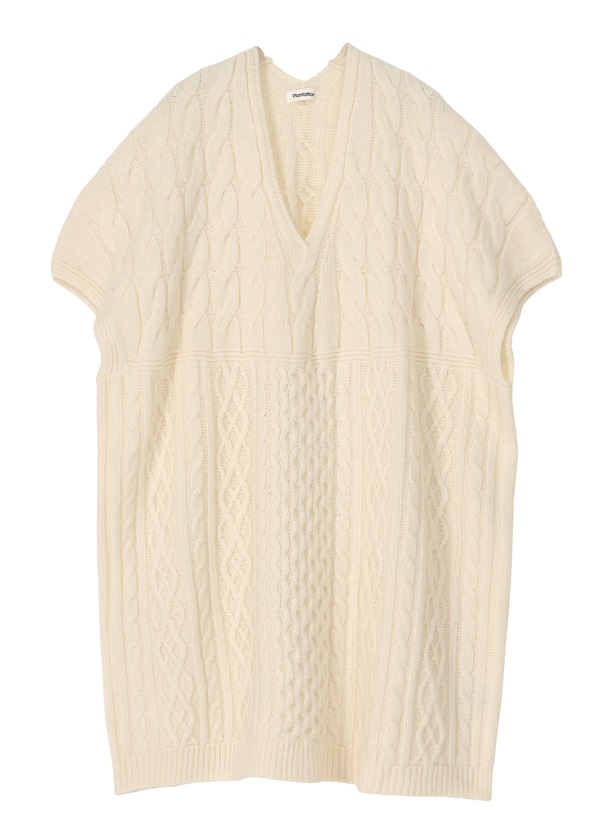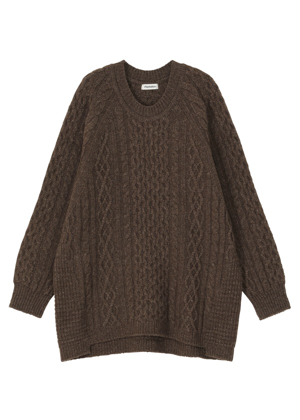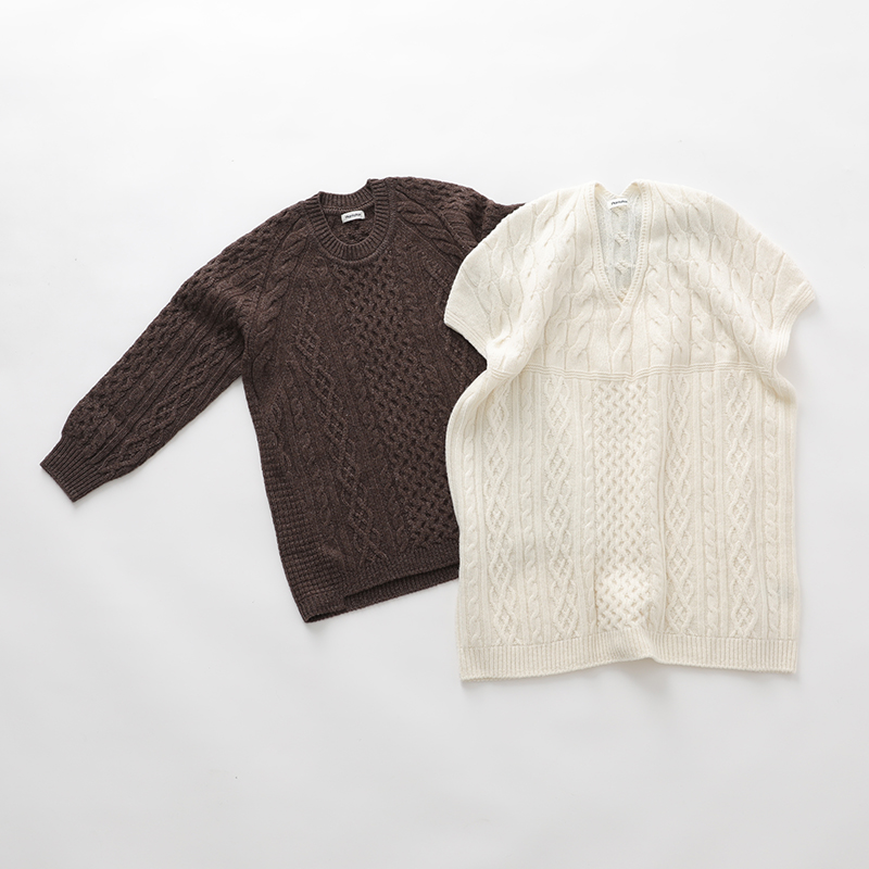 膨らみのあるウール糸とナイロン色を混紡しバルキー感を出した糸を使用することで、見た目よりも軽くあたたかい着心地に。ホールガーメントにすることで肌あたりもやさしい仕上がりになっています。