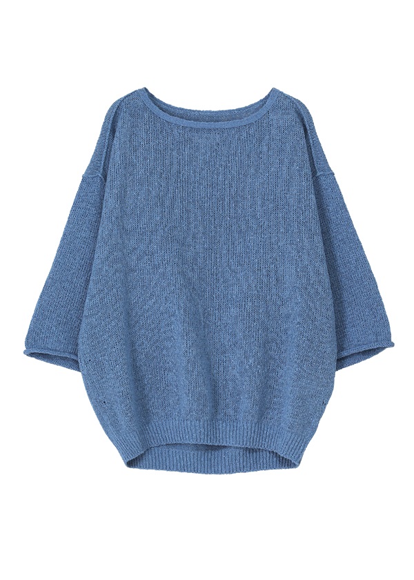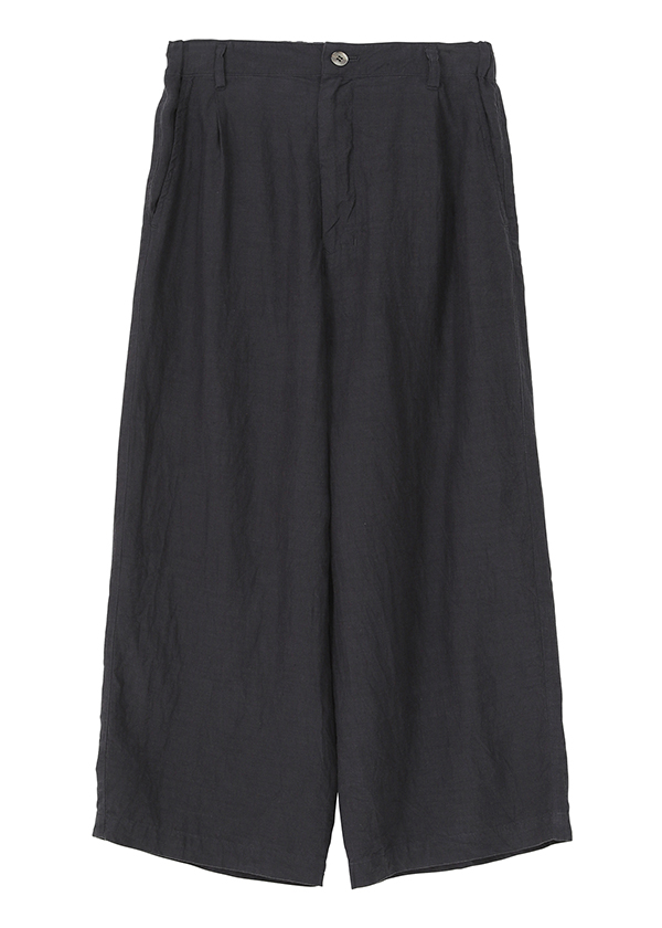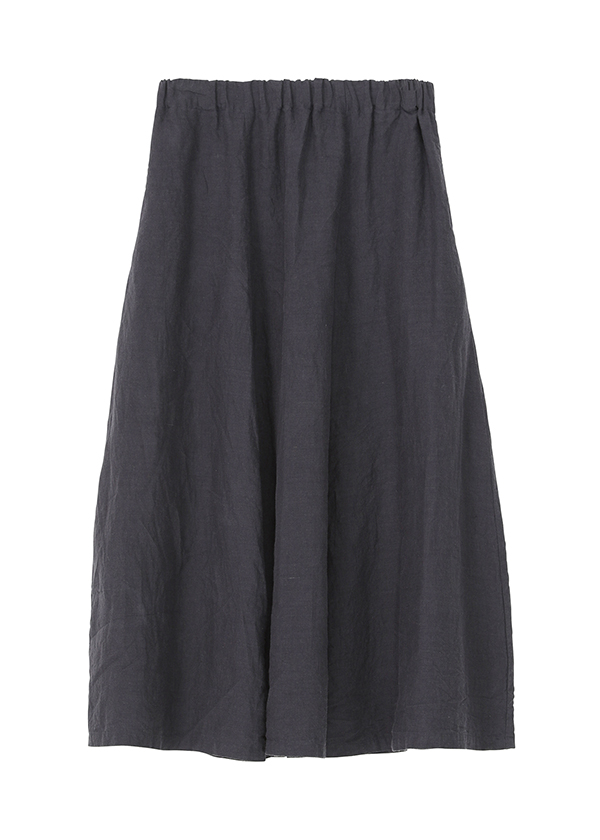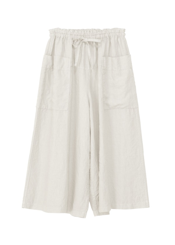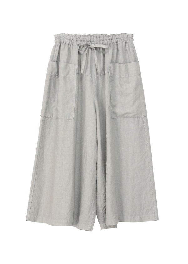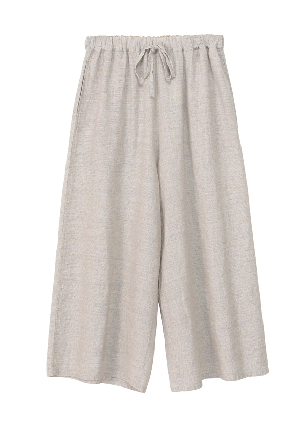 リネン100%のワイドパンツ。ウエスト部分のギャザーやたっぷりとしたボリュームが女性らしいデザインです。ブルーのニットを合わせて、目にもすずやかに。