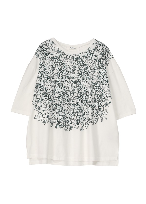 花束のような手書き風のプリントが愛らしい半袖Tシャツには、やさしいライトグリーンのチュニックワンピースをさっと羽織って。ボトムや小物を濃色にすることで、コーディネートが引き締まります。