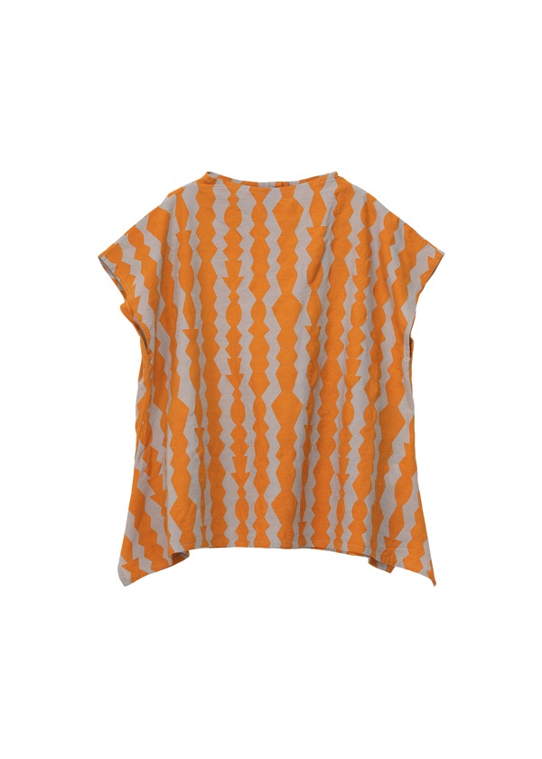 目を惹くオレンジの総柄ブラウスは、オフホワイトのパンツとホワイトのバッグで軽やかにまとめて。初秋には、羽織りを合わせることで長く楽しんでいただけます。