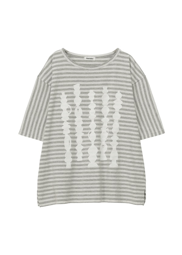 ボーダーにプリントを施したTシャツは、カジュアルすぎず1枚でもコーディネートがまとまります。フレアのラインが美しいスカートとアクセントにはロープベルトを合わせて。