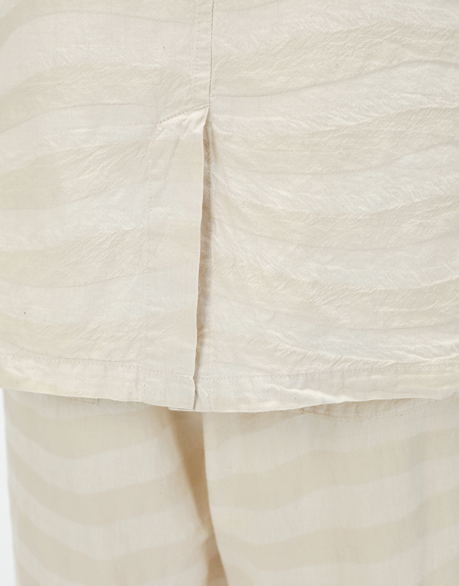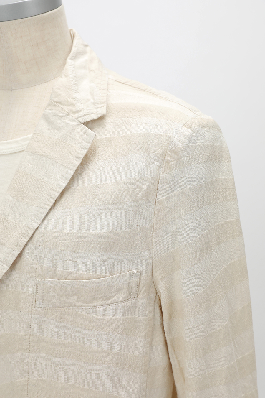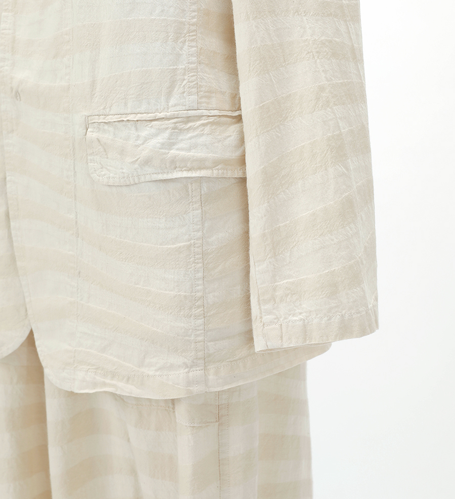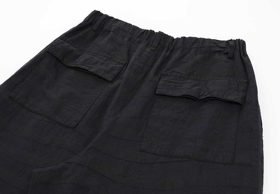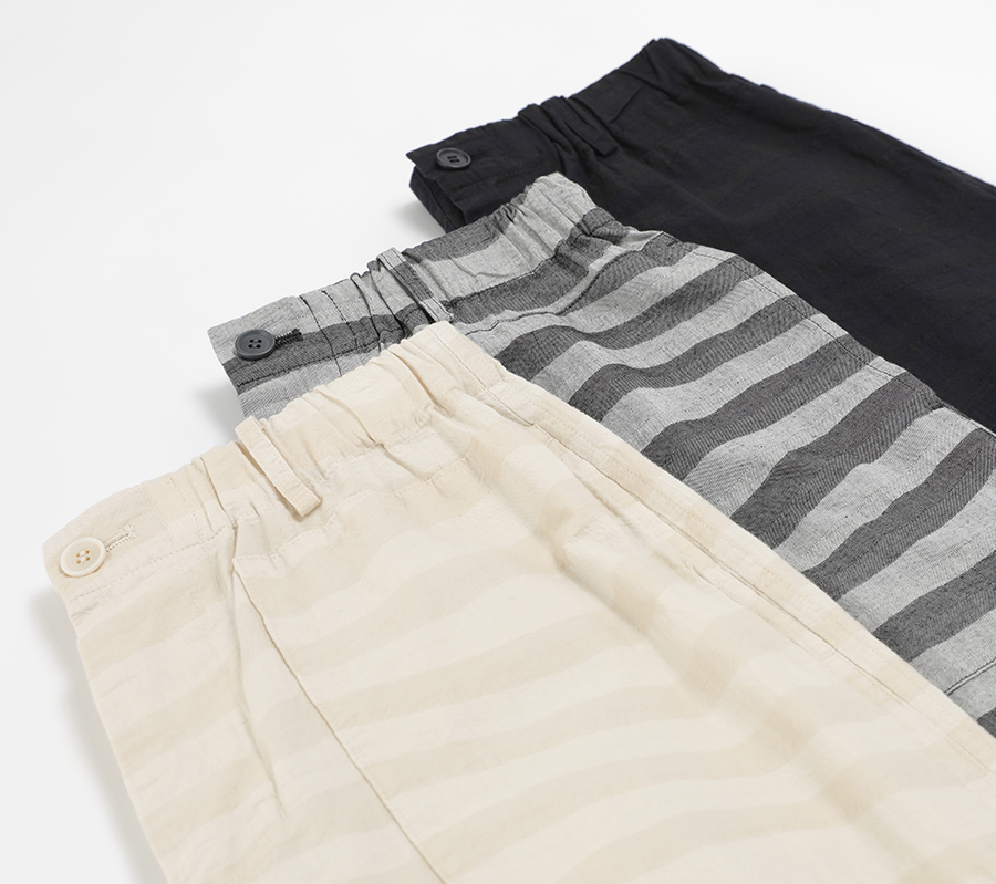 岡山地区のデニム織機で織り上げた、Plantationの定番「BIZENシリーズ」の新作です。綿麻糸を用いているため柔らかさがありながらさっぱりとした心地よさもある素材。今シーズンはナミナミと揺れるような柄をジャガード織機でWAVE状に織り上げました。製品加工を施す事で生まれたソフトなウェーブと、ボーダー状に揺れ動くナミナミWAVEが軽やかな素材です。