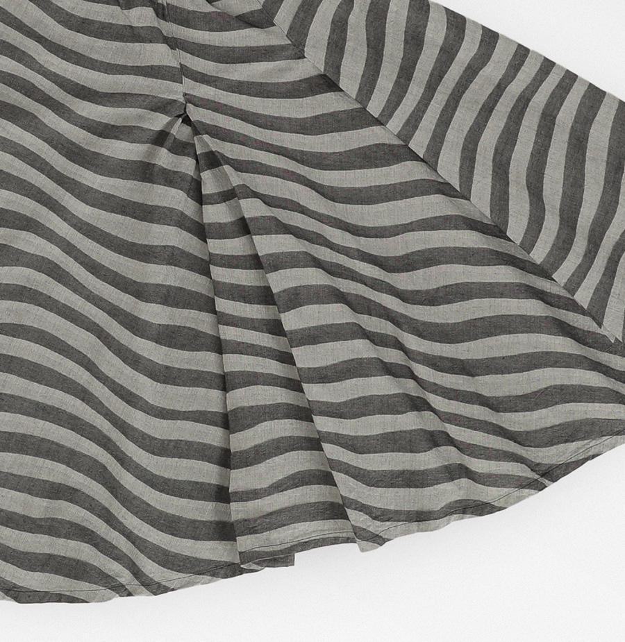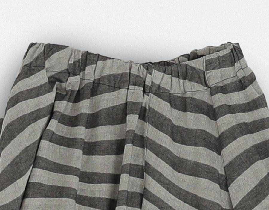 スカートは、広げると円状になるサーキュラー型。一カ所ダーツを入れているので、ランダムなドレープが美しく、ボリュームも軽減してくれます。ウエストはゴム仕様なので、穿き心地柔らかで軽やかな一着です。
