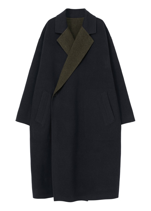 表にニュージーランド産のキーウィラム、裏にオーストラリア産のタスマニアラムを使用しマットな二重織に織り上げたリバー仕立てのコートです。質の良い素材にビーバー加工を施すことで上品な光沢を持つやさしい肌触りの「上質でありながらリラックス感のある素材」に仕上がりました。
