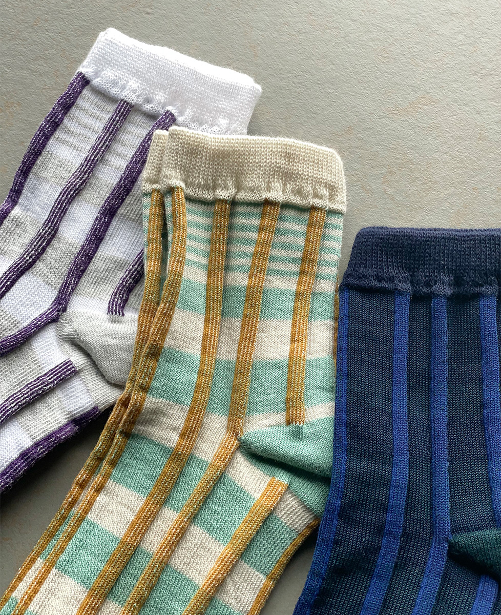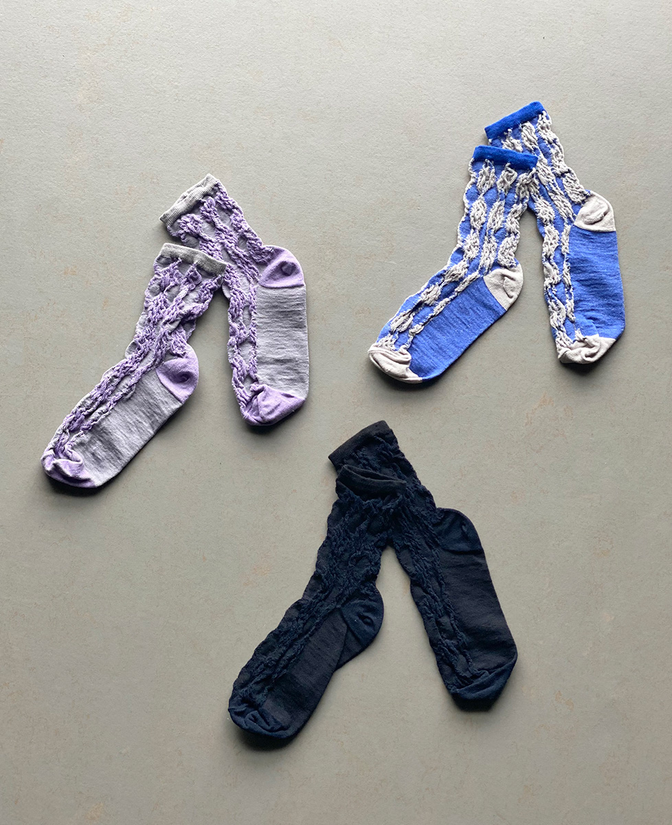 透け感のあるカノコ編みをベースに、表目でライン状のブロック柄を入れたソックス。