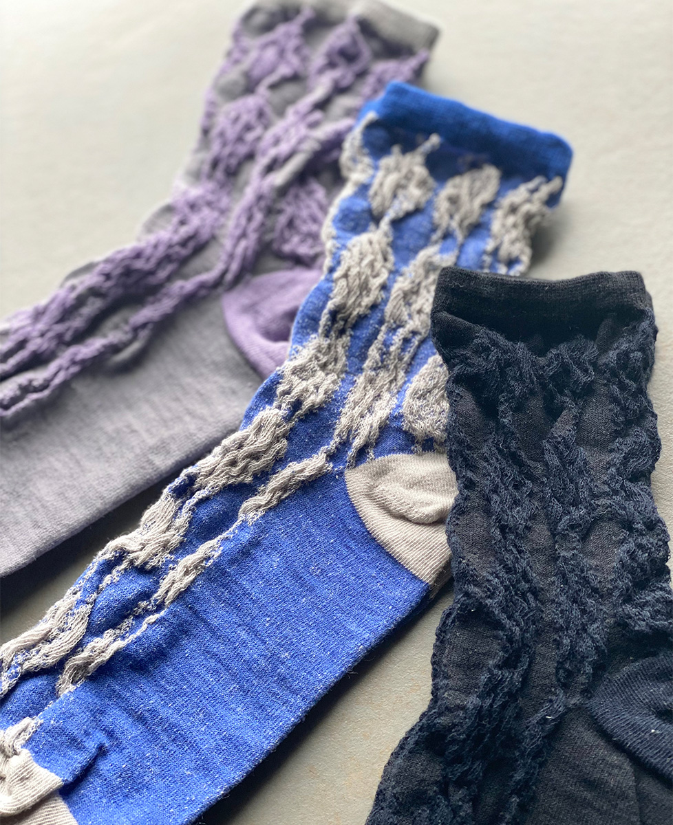 くしゅくしゅとした素材感が印象的なSHIBORI柄を立体的に表現したソックス。
