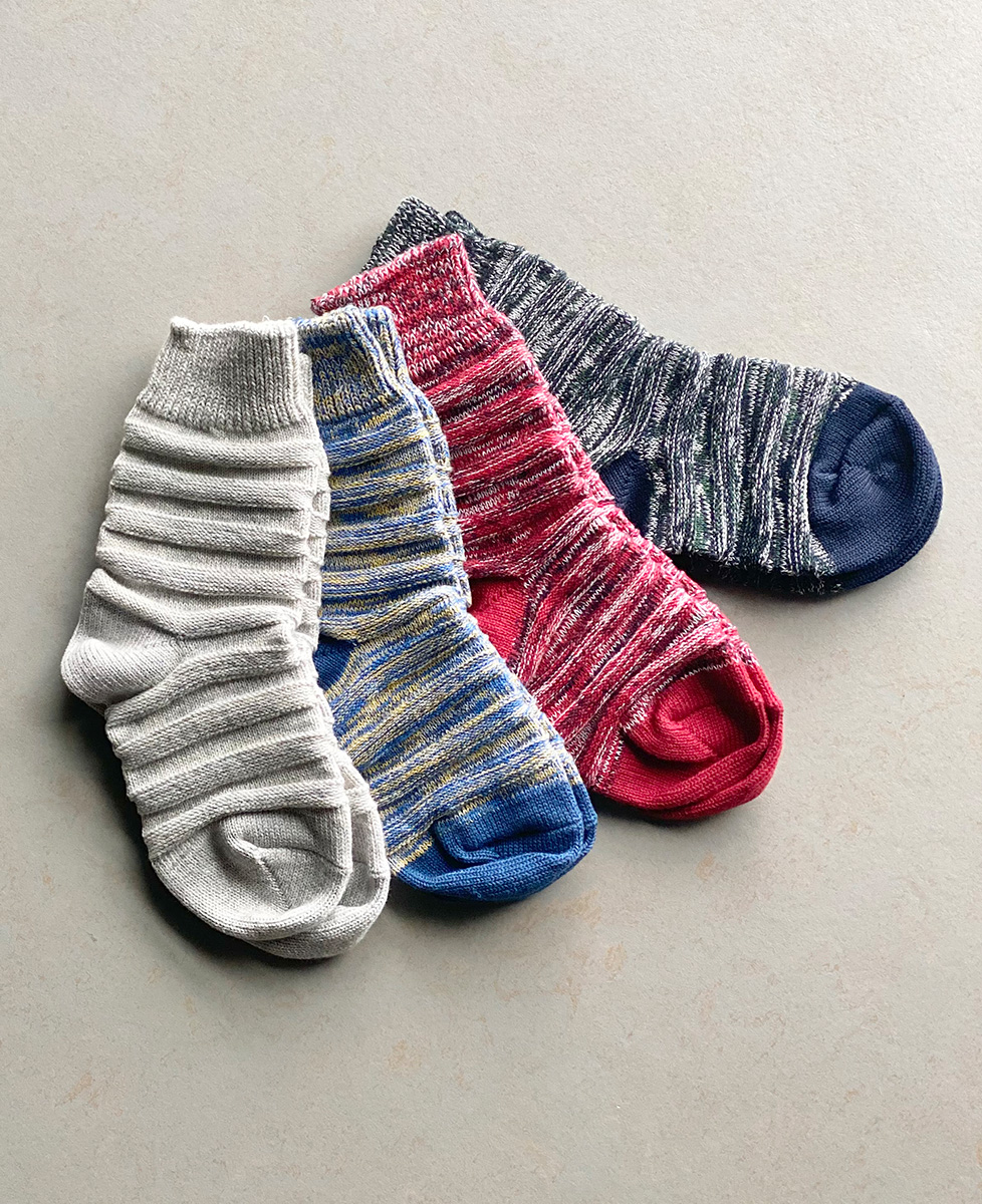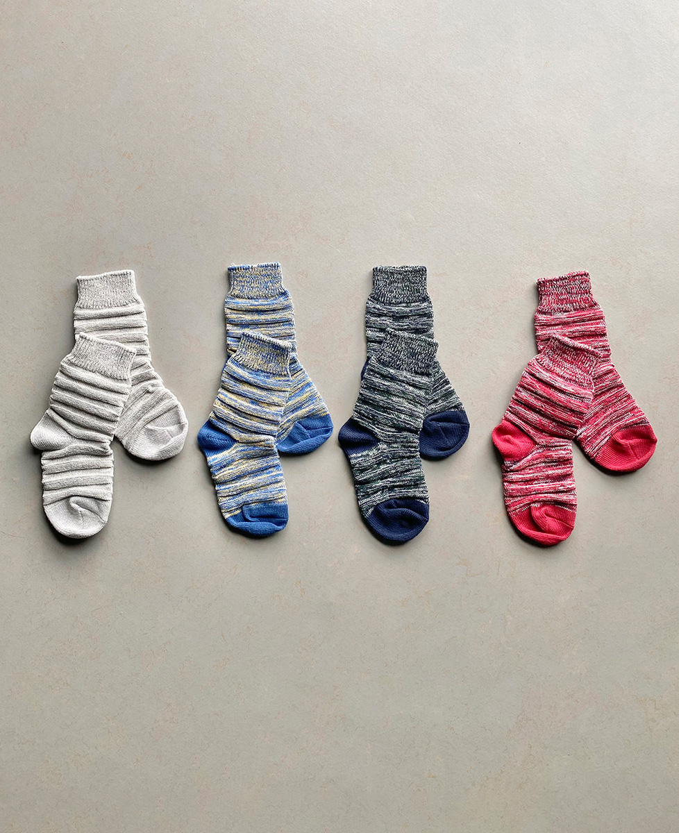 綿糸を多色使いし、雰囲気のあるカラーバリエーションでそろえたソックス。もこもことした素材感が特徴的。