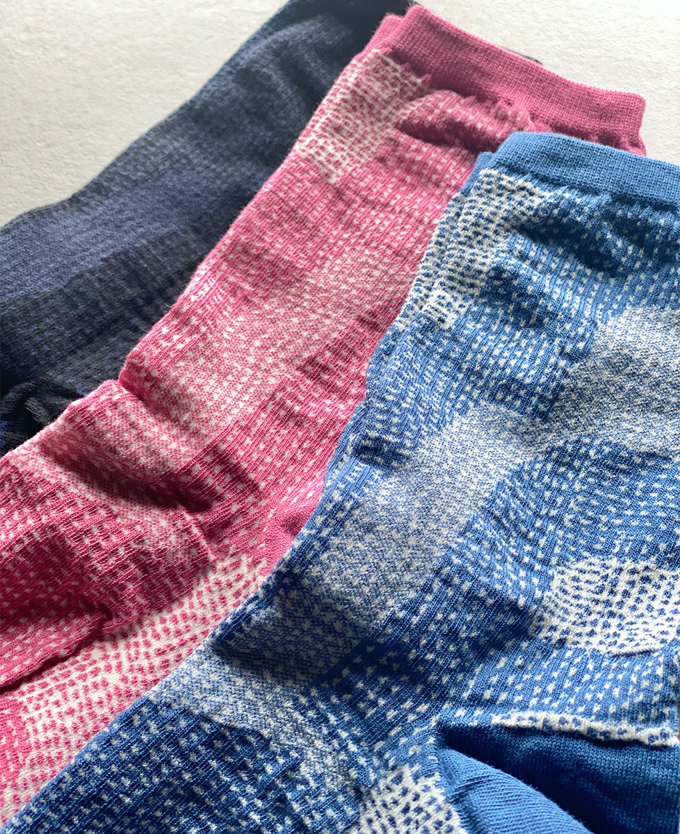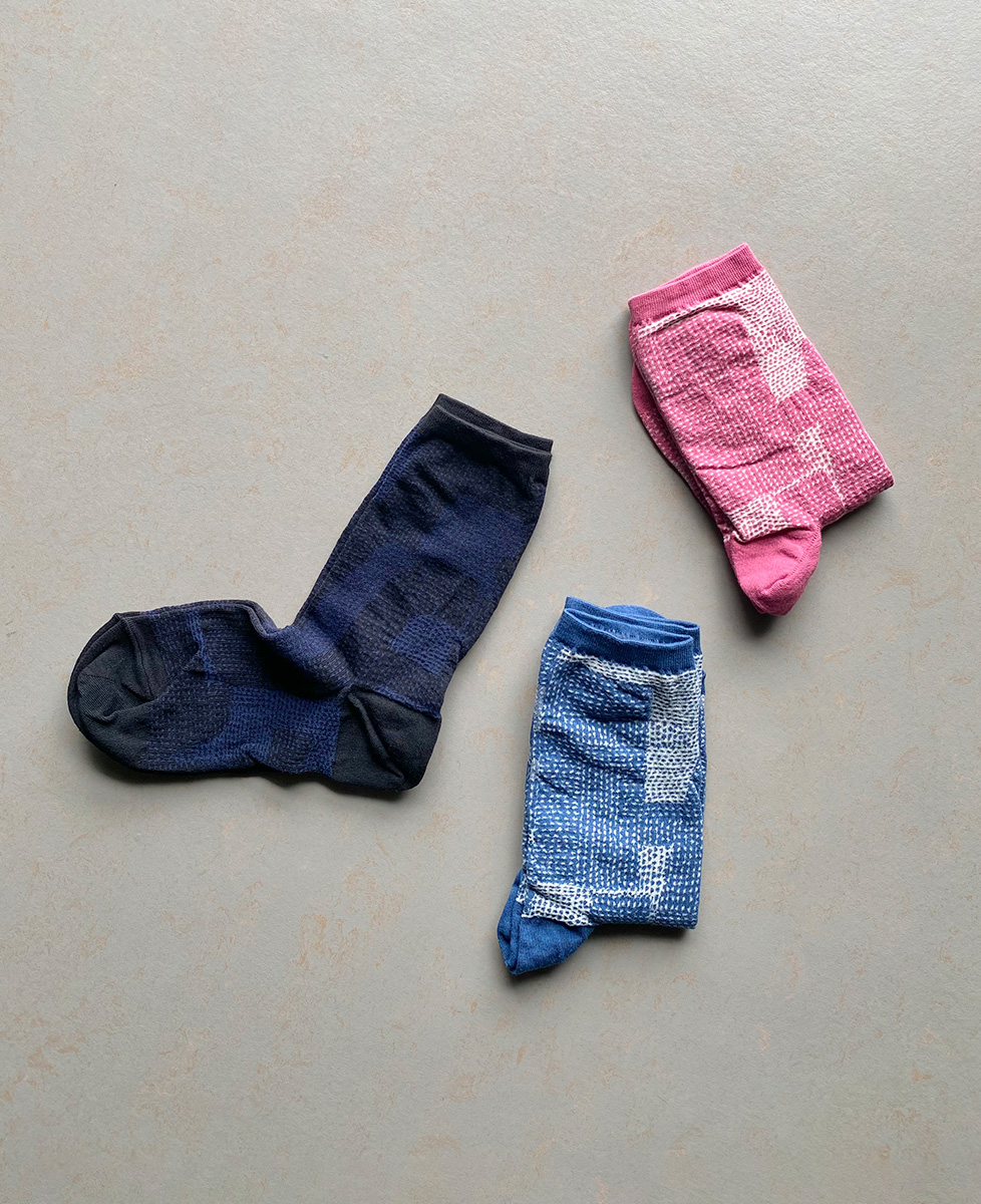 布を継ぎ接ぎして一針一針ステッチを指して繕っているイメージを、パッチワークのような柄で表現したソックス。
