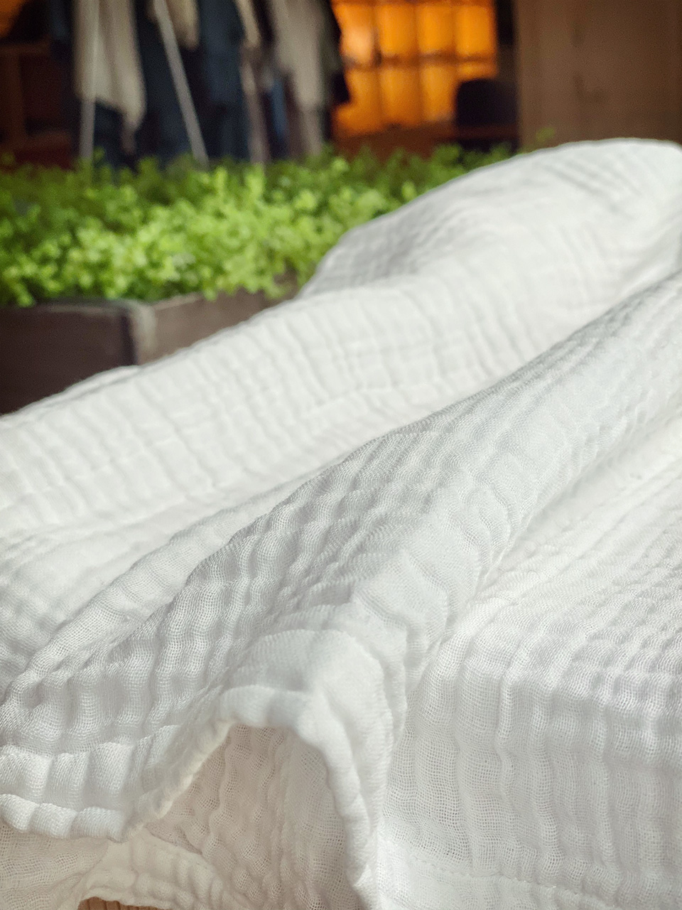 表面のやわらかい織り皺が空気を含み、やわらかく温もりのある触感で包んでくれるマシュマロガーゼ。普段のおうち時間も、至福のリラックスタイムに。