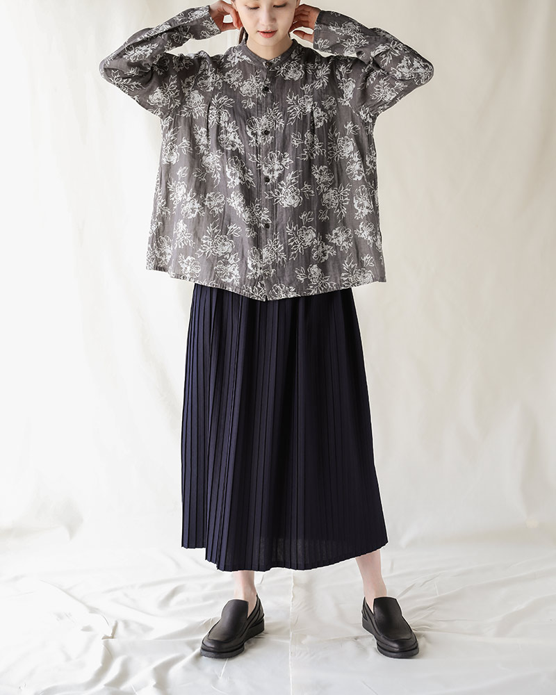 生地の軽やかさをいかしたふんわりとしたシャツは、肌あたりがやわらかで適度に蒸れを逃がしてくれます。寒い季節はニットなどのインナーに、あたたかくなるとさらりと1枚で楽しめる心地よさと通気性を兼ねそなえています。